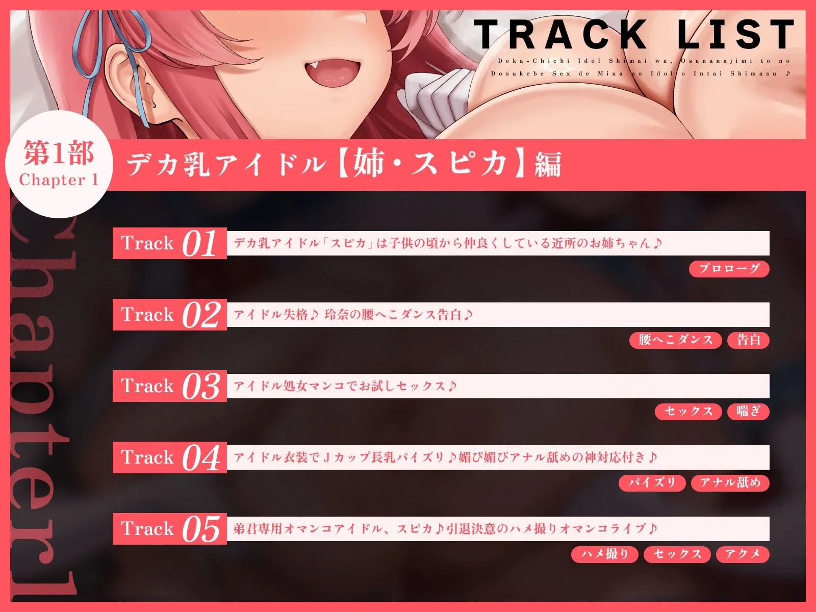 人気絶頂のデカ乳アイドルユニット「スピカとルミナ」の姉妹は、実はあなたの幼馴染だった。ある日、姉の玲奈が重要な話があると部屋にやってくる。アイドル活動をやめたいという玲奈の理由は、子供の頃からずっと好きな人がいるから。その相手とは、もちろんあなた。玲奈はあなたの性癖を熟知しており、「お姉ちゃんの夢は弟君だけのオマンコアイドルになることなの♪」と大胆に迫ってくる。「弟君のためなら、ドスケベなドM女にだってなってみせるよ?」と裸になって生のデカ乳を見せつけ、アイドル失格のドスケベな告白を始める…。