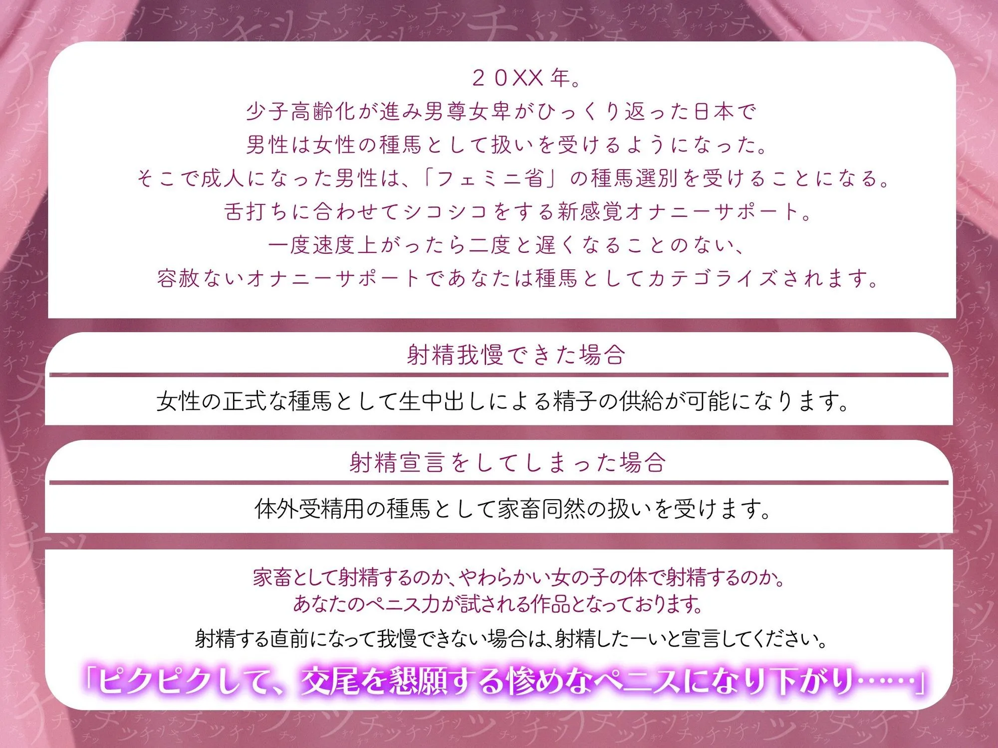 20XX年。少子高齢化が進み男尊女卑の不貞概念がひっくり返ったに日本で、男性は女性の種馬として扱いを受けるようになった。