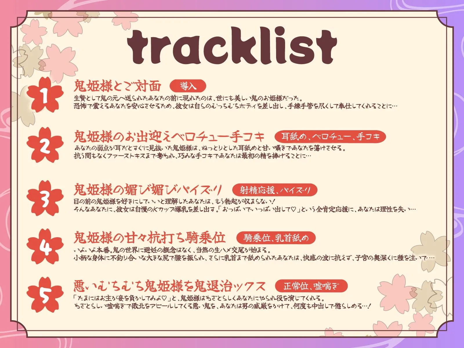 あなたの弱点が耳だとすぐに見抜いた鬼姫様は、ねっとりとした耳舐めと甘い囁きであなたを蕩けさせる。