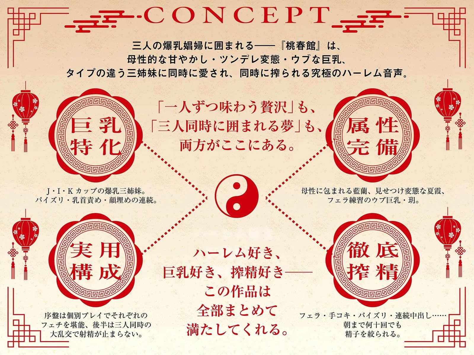 三人の爆乳娼婦に囲まれる――『桃春館』は、母性的な甘やかし・ツンデレ変態・ウブな巨乳、タイプの違う三姉妹に同時に愛され、同時に搾られる究極のおねしょたハーレム音声!