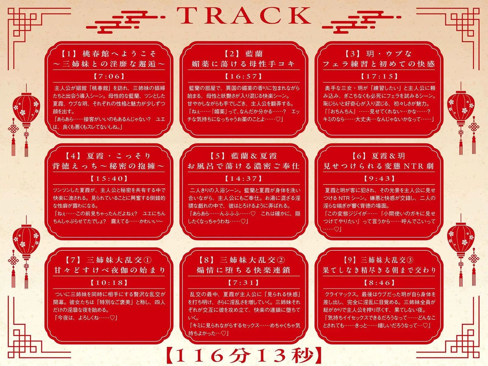 主人公が娼館「桃春館」を訪れ、三姉妹の娼婦たちと出会う導入シーン。母性的な藍蘭、ツンとした夏霞、ウブな玥、それぞれの性格と魅力が少しずつ顔を出す。