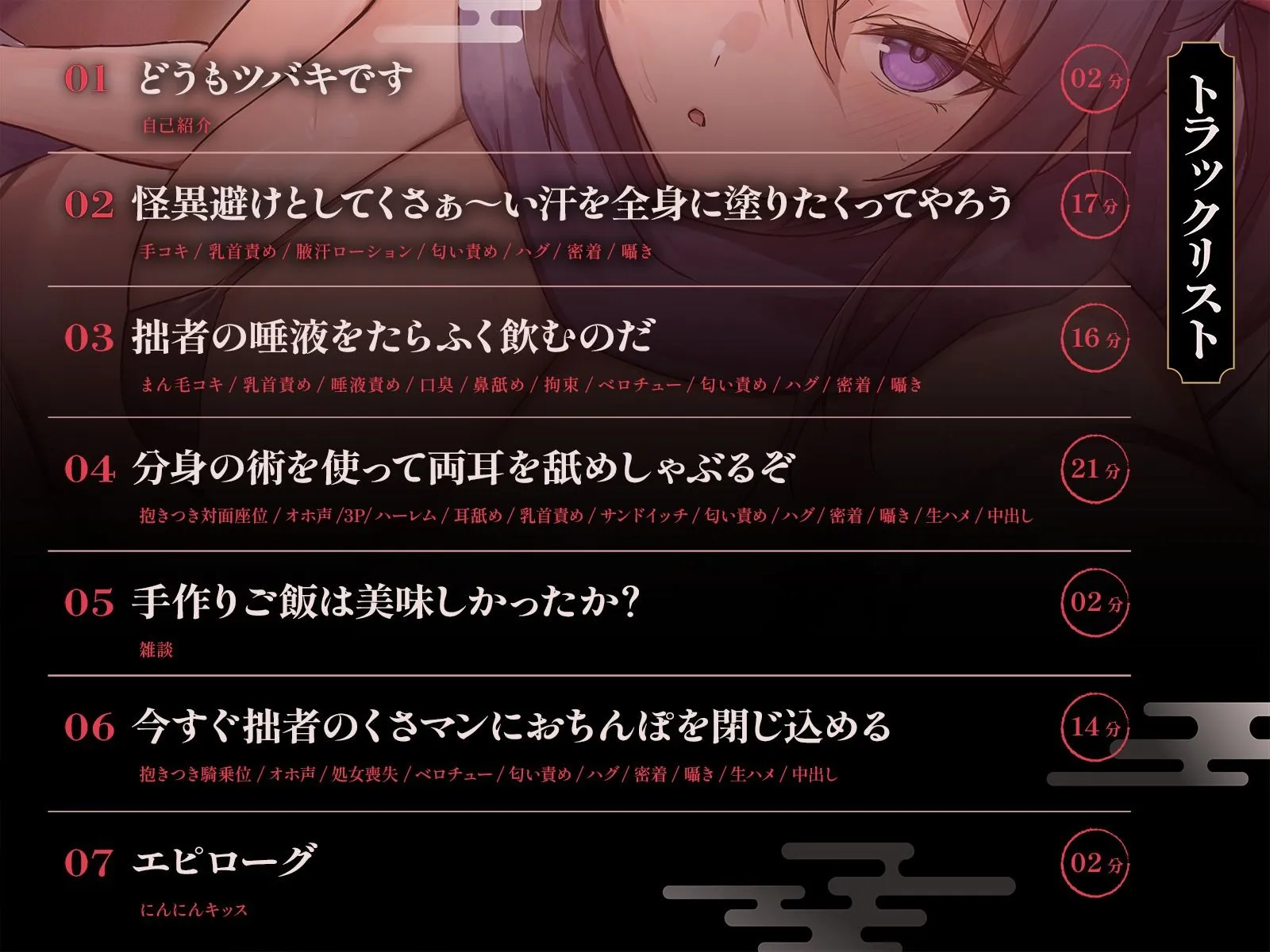 [まん毛コキ/乳首責め/唾液責め/口臭/鼻舐め/拘束/ベロチュー/匂い責め/ハグ/密着/囁き]