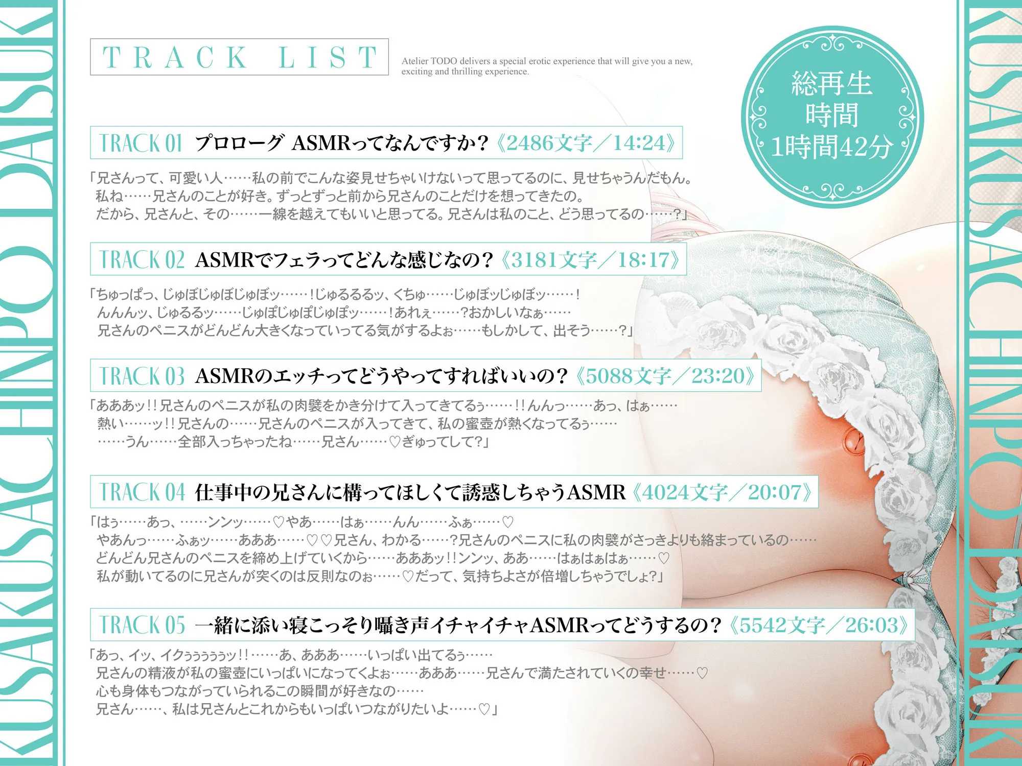 ASMRのポイントは数が多く、その都度、澪は義兄に練習台になってもらうことに。そして、ついに二人のイチャラブは一線を超える。