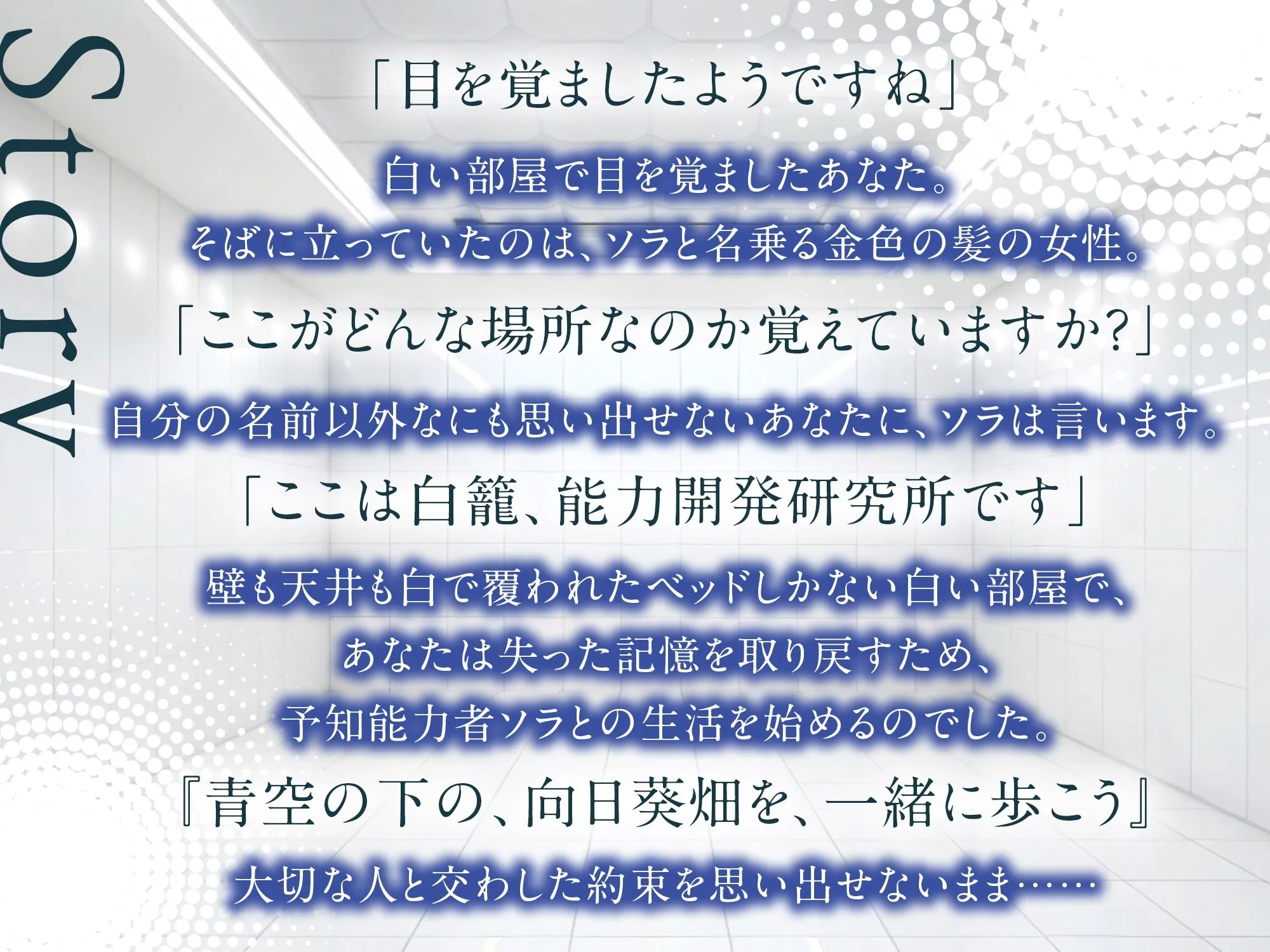 壁も天井も白で覆われたベッドしかない白い部屋で、あなたは失った記憶を取り戻すため、予知能力者ソラとの生活を始めるのでした。