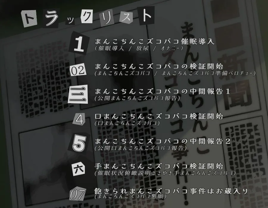 サンプルは「01.まんこちんこズコバコ催○導入」「03.まんこちんこズコバコの中間報告1」を全て聞くことができます