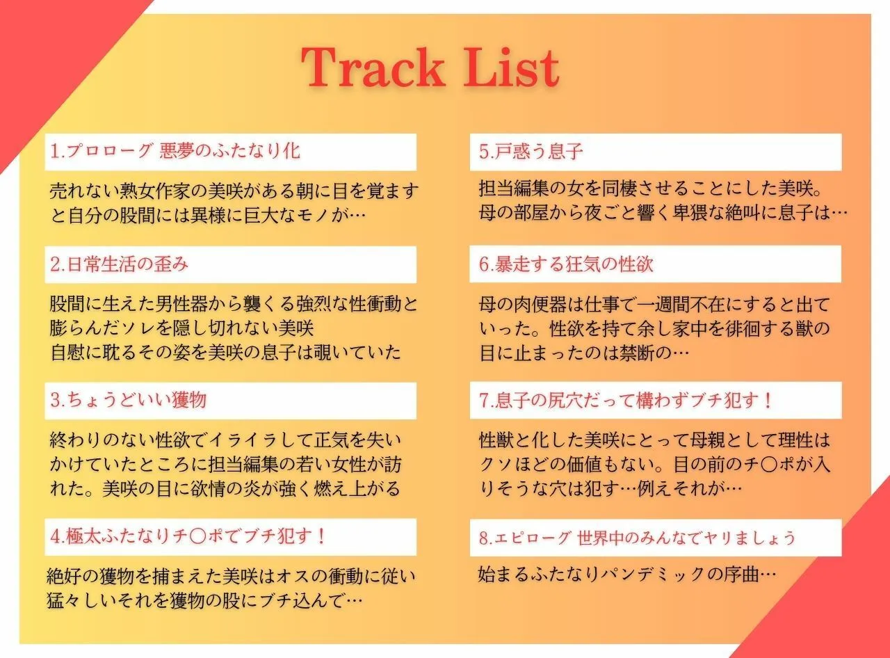 股間に生えた男性器から襲くる強烈な性衝動と膨らんだソレを隠し切れない美咲。自慰に耽るその姿を美咲の息子は覗いていた
