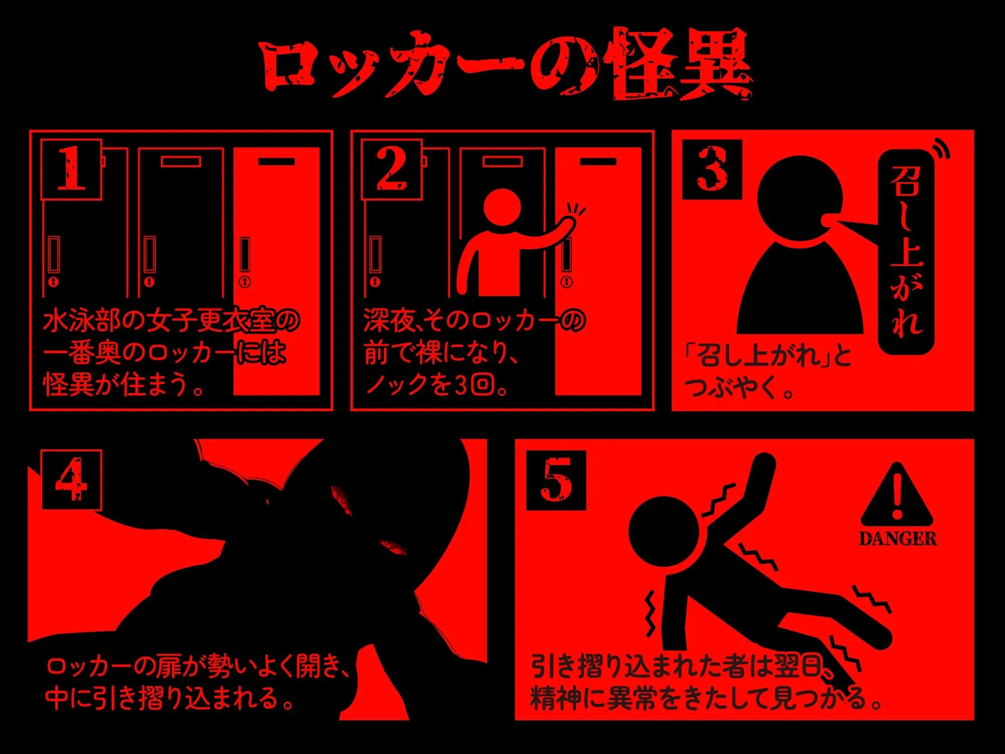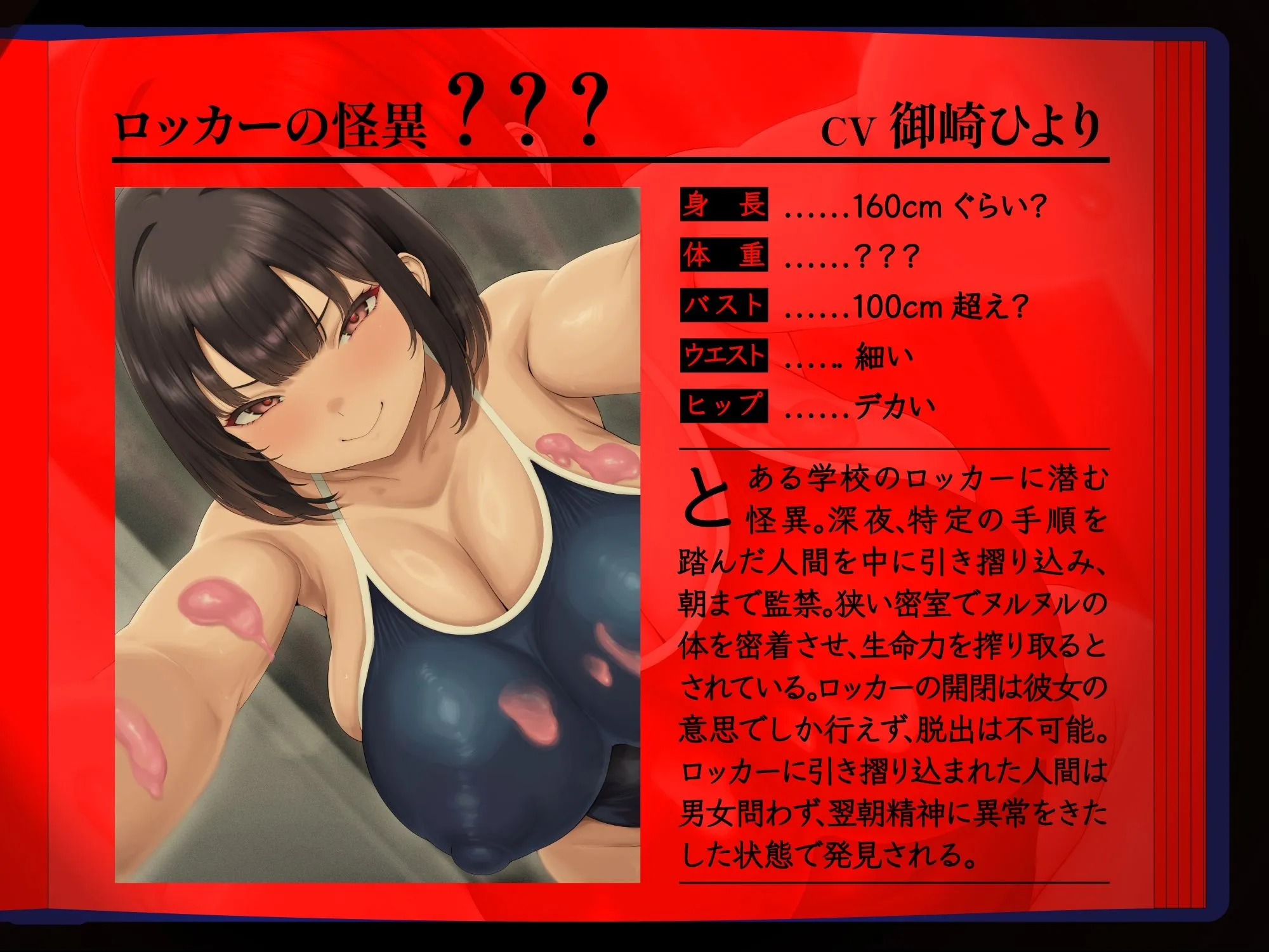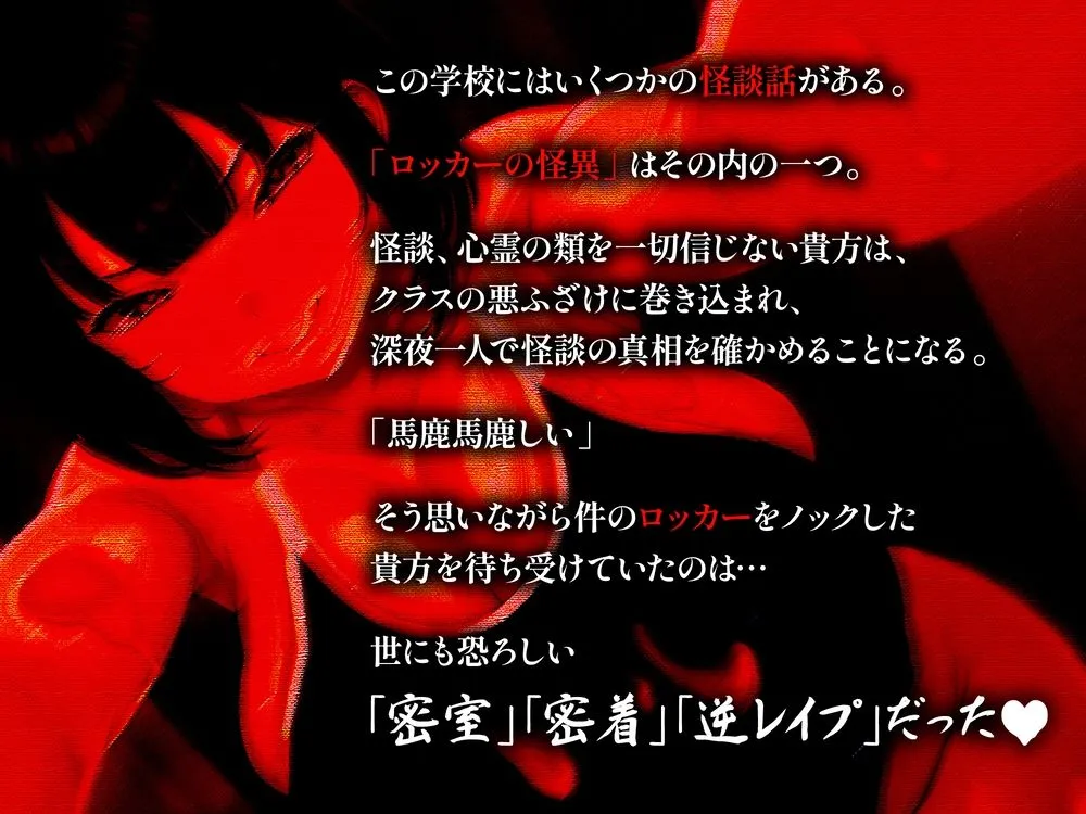 この学校にはいくつかの怪談話がある。「ロッカーの怪異」はその内の一つ。怪談、心霊の類を一切信じない貴方は、クラスの悪ふざけに巻き込まれ、深夜一人で怪談の真相を確かめることになる。「馬鹿馬鹿しい」そう思いながら件のロッカーをノックした貴方を待ち受けていたのは…世にも恐ろしい「密室」「密着」「逆レ●プ」だった(はーと)