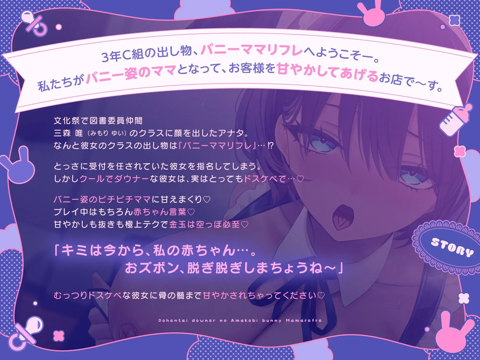 ダウナーバニーママに癒されまくり♪ 文化祭で図書委員仲間のクラスに顔を出したアナタ。なんと彼女のクラスの出し物は『バニーママリフレ』? とっさに受付を任されていた彼女を選んでしまったアナタ。いつもクールな彼女は実はとってもドスケベで…♪ バニー姿のピチピチママに癒されまくり♪ 骨の髄までトロトロに甘やかされちゃってください!