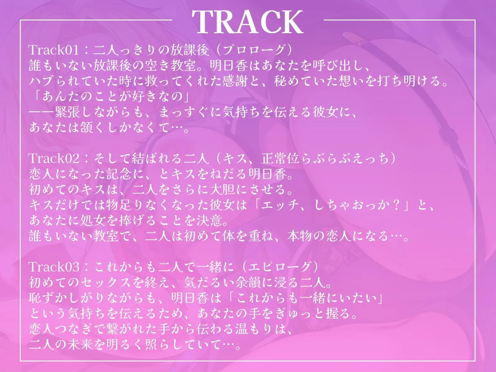 恋人になった記念に、とキスをねだる明日香。初めてのキスは、二人をさらに大胆にさせる。キスだけでは物足りなくなった彼女は「エッチ、しちゃおっか?」と、あなたに処女を捧げることを決意。誰もいない教室で、二人は初めて体を重ね、本物の恋人になる…。