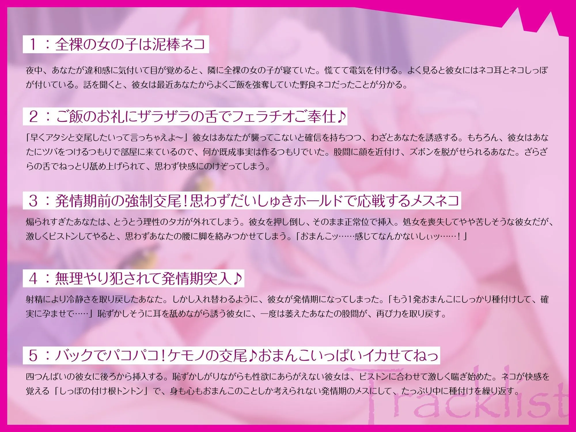 夜中、ふと違和感に気が付いて目が覚めると、隣に見知らぬ女が全裸で寝ていた!話を聞くと、彼女は最近あなたからご飯を強奪しているネコだということが分かり……。軽い気持ちであなたにすり寄ってきたメスネコを強○発情させて思い切り生交尾♪