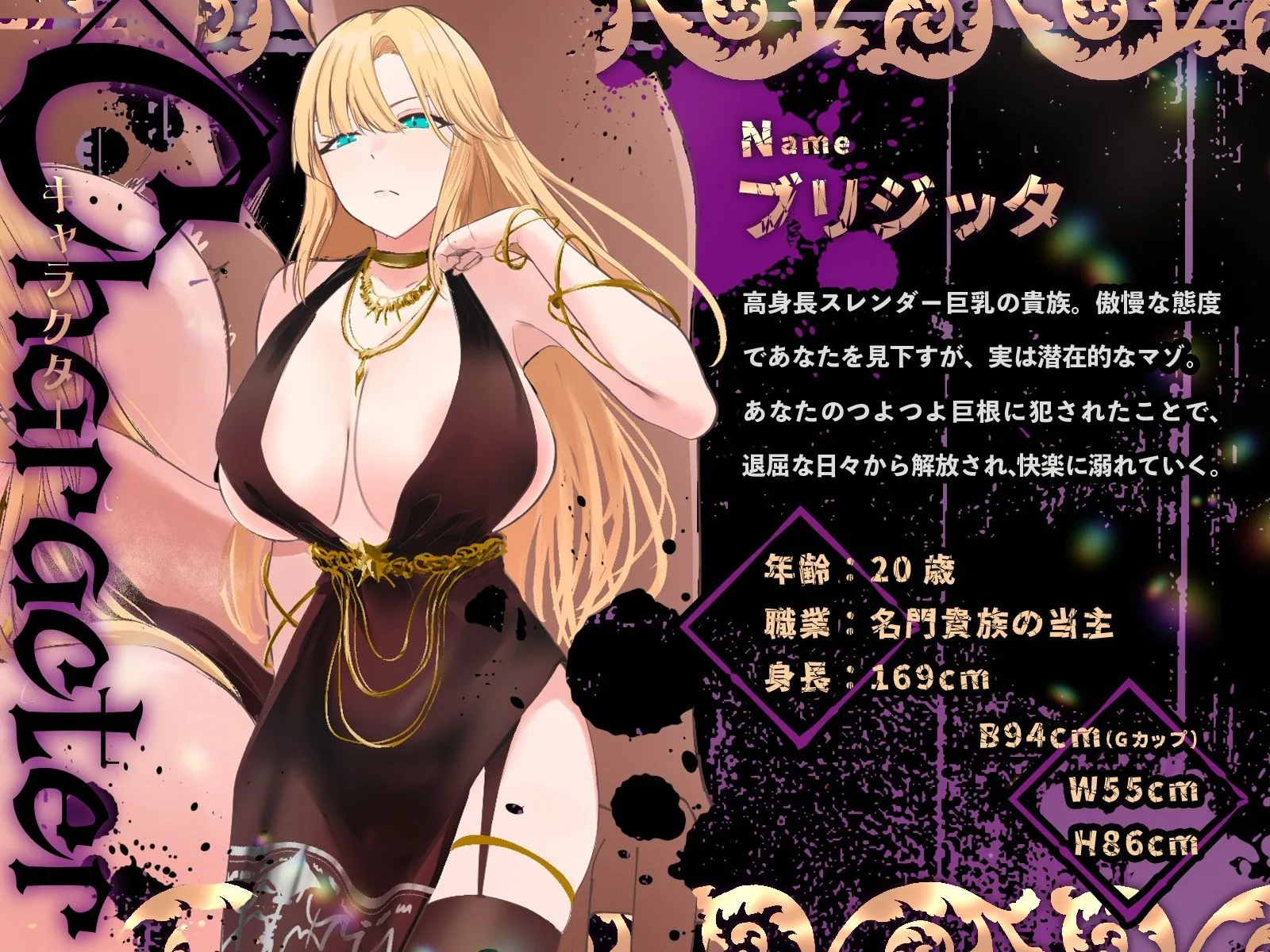 高身長スレンダー巨乳の貴族。傲慢な態度であなたを見下すが、実は潜在的なマゾ。