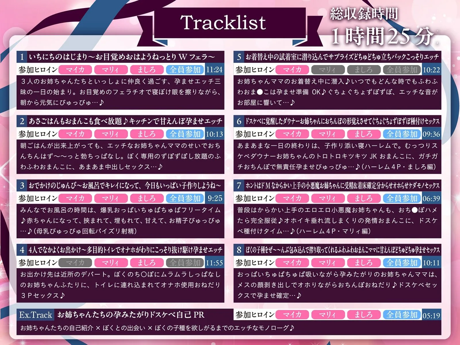 9トラック中7トラックが3ヒロイン全員参加、絶妙な掛け合いが織りなす、ぼくと爆乳お姉ちゃんママたちの、「ず〜〜〜っと気持ちイイ」孕ませ確定子作りドスケベ性活。ずぽずぽ×ぐちょぐちょ×びゅっびゅ、媚び媚びおねだりされるがまま種付けセックスの毎日に没入せよ…!