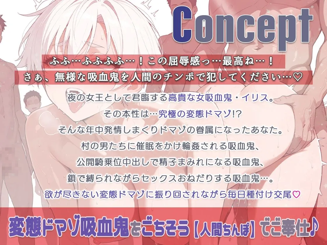 「ああ…高貴な私が、ただの人間に奴●のように媚びて…ふぁ…たまらないわ…!」死にかけていたあなたを拾ったのは夜の女王として君臨する吸血鬼・イリス。強●的に眷属にされ、血を吸いつくされるかと思いきや…イリスがまさかのあなたに凌●懇願。超ドマゾな本性を露わにし、全身で媚びまくり喘ぎまくり!催●に媚薬、魔道具まで何でもあり。性欲が強すぎる変態吸血鬼と城でも外でも荒々しく種付け交尾
