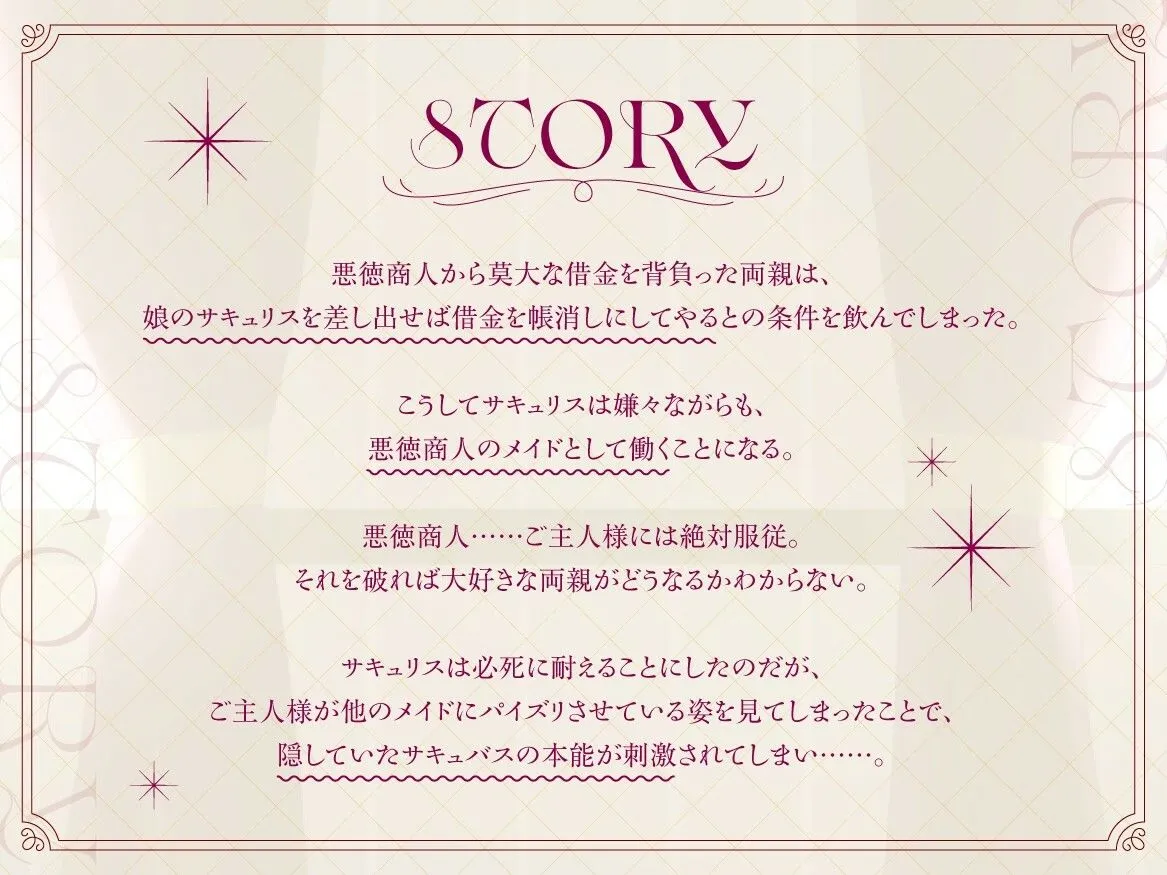 サキュリスは必死に耐えることにしたのだが、ご主人様が他のメイドにパイズリさせている姿を見てしまったことで、隠していたサキュバスの本能が刺激されてしまい......。
