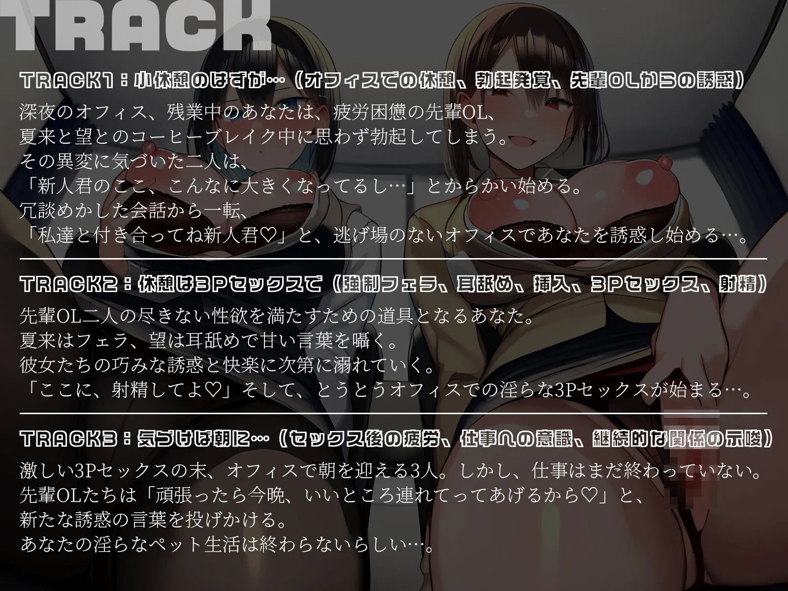 冗談めかした会話から一転、「私達と付き合ってね新人君(はーと)」と、逃げ場のないオフィスであなたを誘惑し始める…。