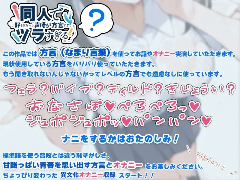 標準語を使う普段とは違う恥ずかしさ、故郷や田舎、甘酸っぱい青春を思い出す方言オナニーをお楽しみください。