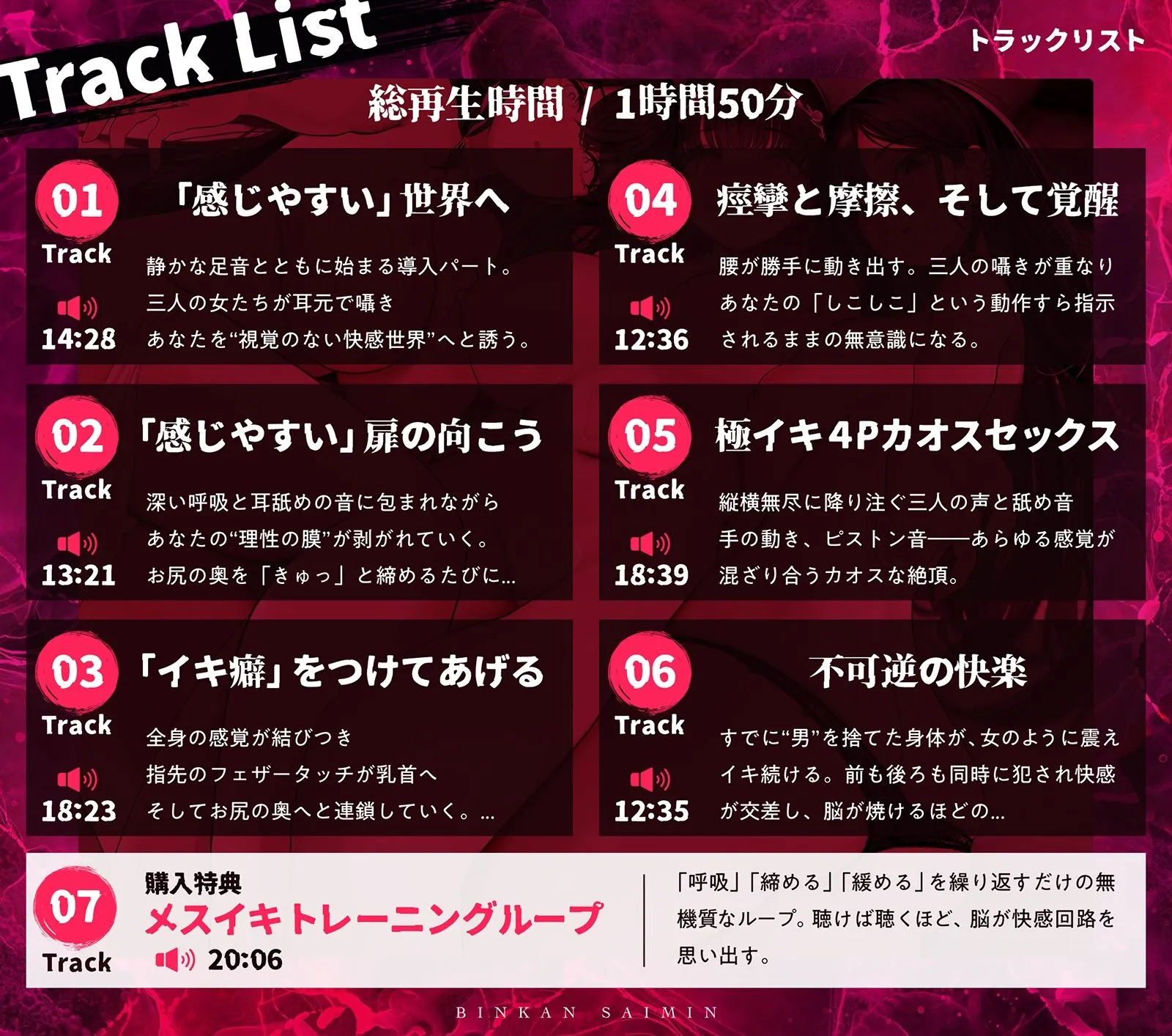 全身の感覚が結びつき、指先のフェザータッチが乳首へ、そしてお尻の奥へと連鎖していく。乳首をくりくりと弄るたび、身体の奥から熱がこみ上げ、‘男の性感’が‘女の快感’へと変換されていく。理性を剥がされ、触れただけでイってしまう‘イキ癖’が刻まれる。くすぐるような囁きと舐め音の連打が、まるであなた自身の身体を改造していくように響きわたる。