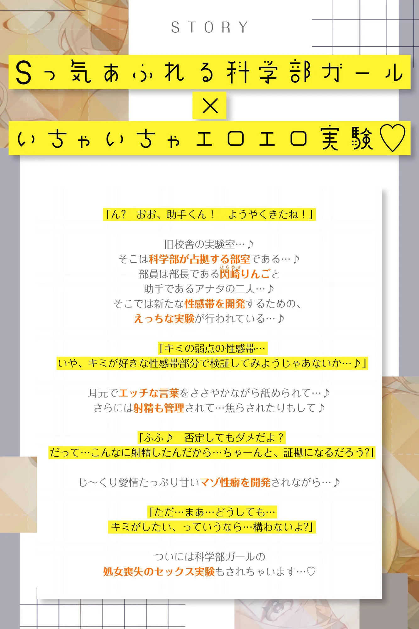 CV:陽向葵ゅか様演じる、Sっ気あふれる科学部ガールとのいちゃいちゃエロエロ実験をたっぷりお楽しみください…♪♪