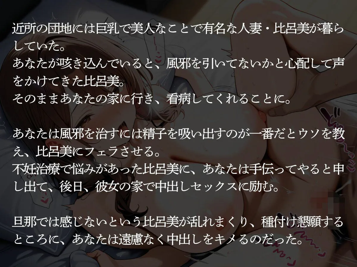 旦那さんでは全然感じないと告白し、あなたの子種を求める比呂美に、遠慮なく連続中出しをキメて、孕ませてやるのだった。