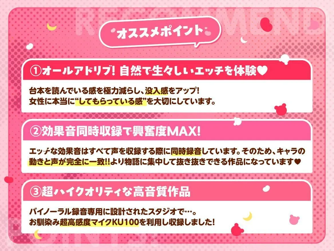 (耳舐めでおちんぽ勃起サポート/ベロチューしながら生挿入/声出しちゃダメ♪おまんこで先っぽ責め/マイクに音がしっかり入るように『どちゅどちゅ♪』杭打ちピストン/耳元囁きカウントダウン/中出し)