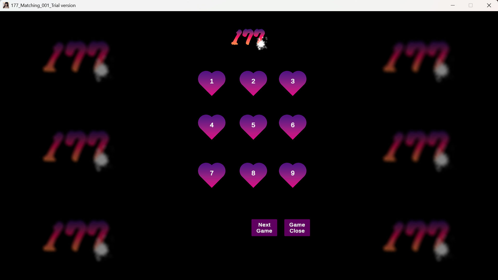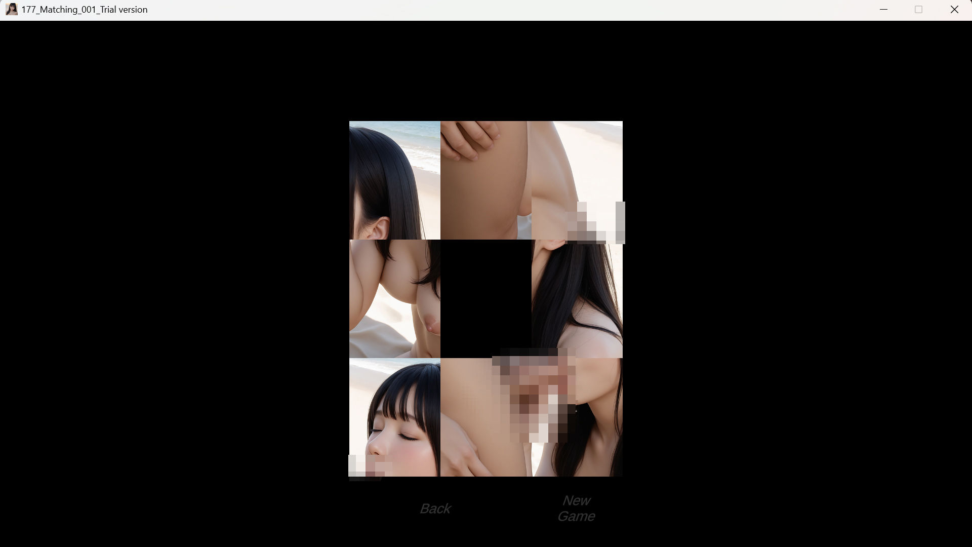 177マッチングは簡単な絵合わせゲームです。全部で18ステージで全てが大人の絵合わせゲームになります。ゲームの大人の絵合わせを1つクリアするとそのステージのボーナスムービーを閲覧することができます。どのようなムービーが閲覧できるのかはぜひお楽しみに。まずは体験版をプレイしてみてください!(体験版には詳しい操作説明はありませんが、ダウンロードしていただいて解凍した中にある実行ファイル、177_Matching_001_Trial versionをダブルクリックしてプレイを始めてください)