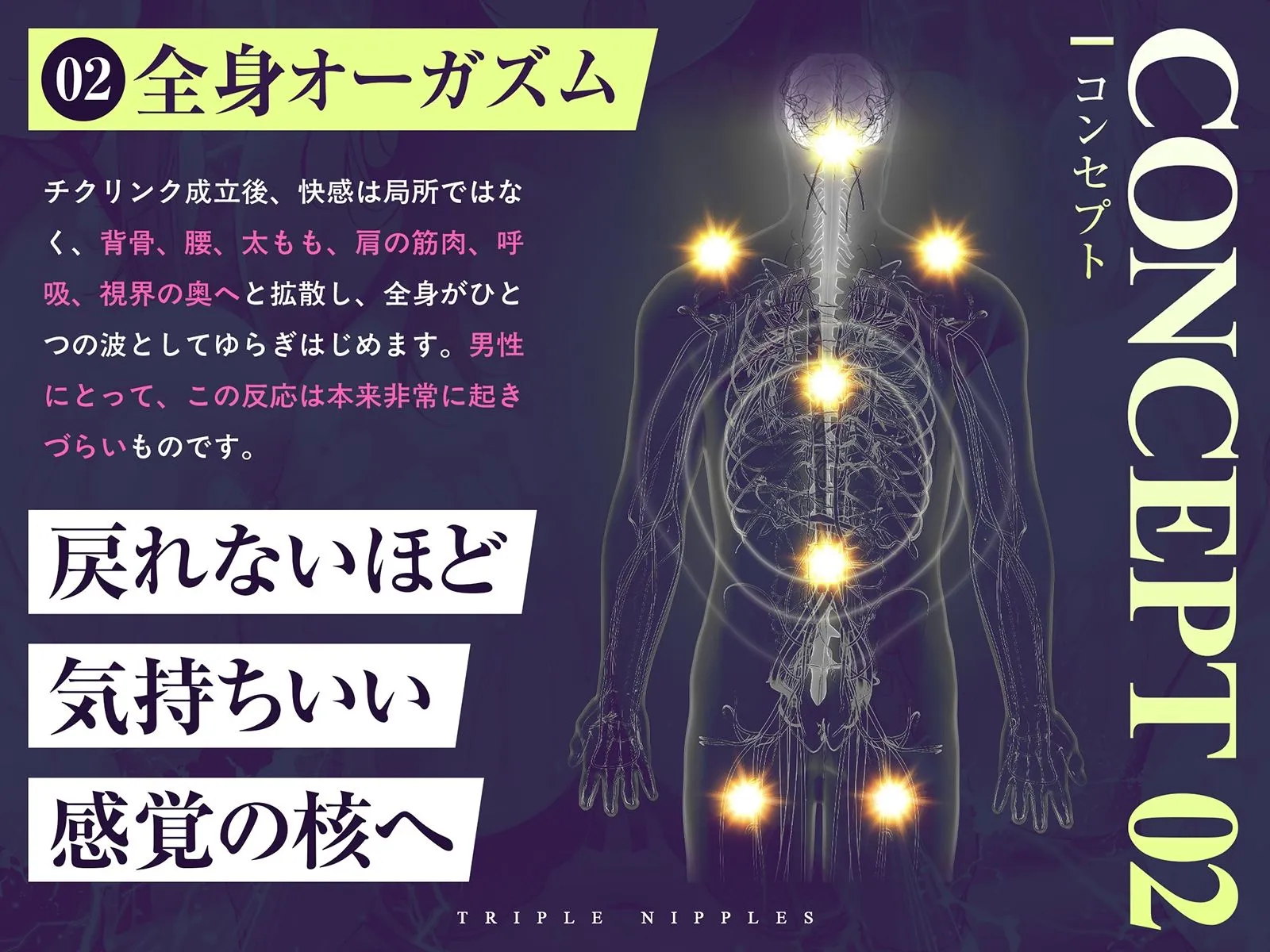 「乳首はくすぐったいだけ」という人も変性意識と音響誘導でかんたん乳首開発。三方向から重ねられる囁きによって快感は一点ではなく‘輪’として「チクリンク」を形成。女性がごく一般的に感じている「全身オーガズム」を疑似的ではなく生理的に体験しよう!