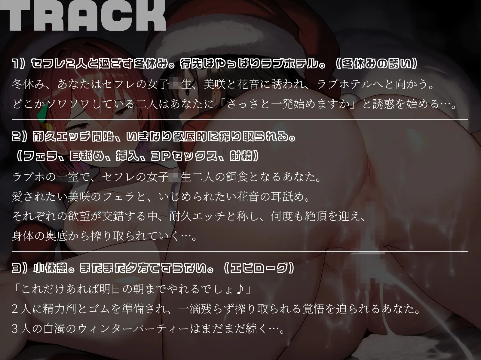 冬休み、あなたはセフレの女子校生、美咲と花音に誘われ、ラブホテルへと向かう。