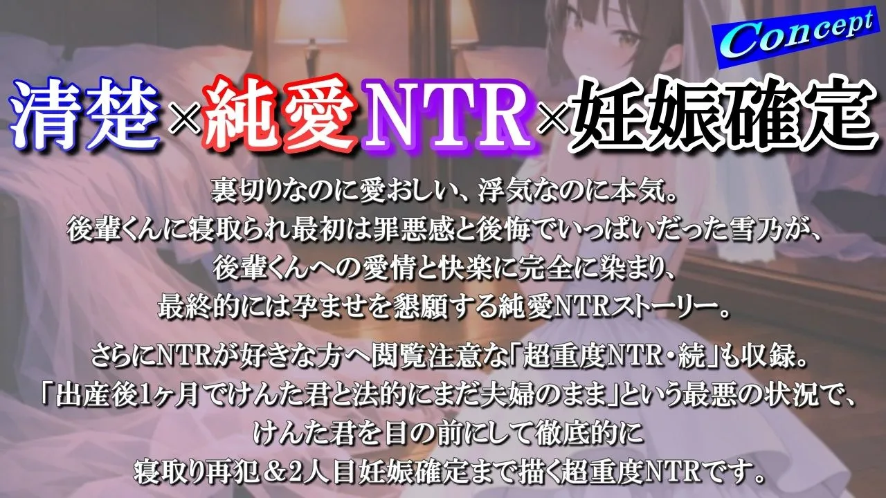 後輩くんに寝取られ最初は罪悪感と後悔でいっぱいだった雪乃が、後輩くんへの愛情と快楽に完全に染まり、最終的には孕ませを懇願する純愛NTRストーリー。