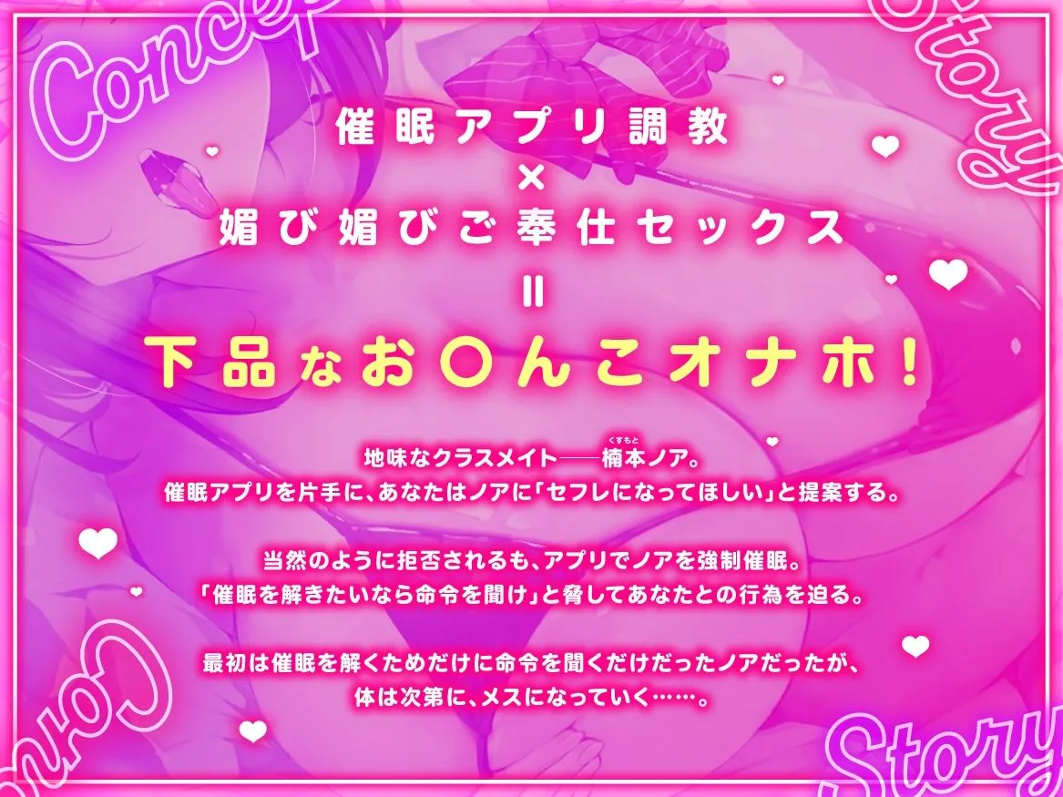 地味で影薄いクラスメイト・楠本ノア。地味な見た目に隠されたむっちり爆乳と桃尻の極上ボディ。催●アプリで蕩ける熱と蜜穴の疼きを植え付け、「この火照りはチンポでしか鎮まらない」「命令に従えば楽になる」と甘く囁く。嫌悪の目で拒みながらも、溢れる愛液と震える腰に耐えきれず、涙目で跪く。喉奥まで犯●れ下品なオ下品な雌喘ぎが漏れ、名器膣が貪欲に締め付けるたび……地味子の仮面が剥がれ、ドスケベ雌豚の本性が覚醒する──。