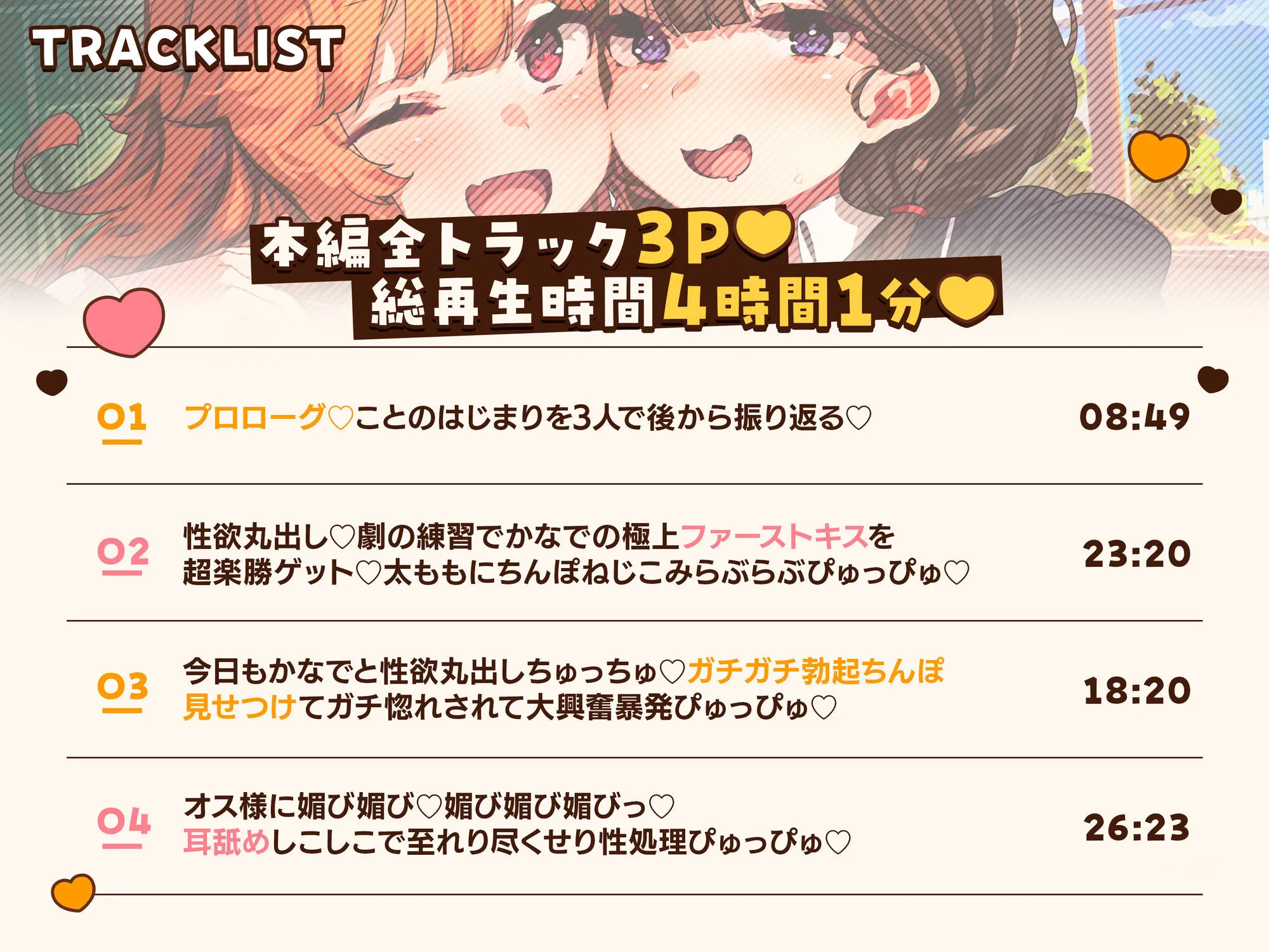 (両耳ふう/両耳元で唾液ぐちゅぐちゅ♪/両耳舐め/心情代弁囁き/オナニーカミングアウト/両耳「大好き♪」連呼囁き♪/ガチ惚れ「好きぃ♪」囁き耳舐め/ぴゅっぴゅ連呼&まったり耳はむで射精/両耳元で精液もぐもぐくちゅくちゅごっくん♪)