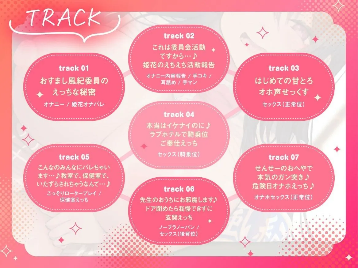 一条姫花はあなたが教師として勤めている学校の風紀委員。 真面目で、清楚で、おっぱいがおっきくて――とってもえっちな女の子(はーと) 放課後の誰もいない教室で、あなたの指を思い出しながらひとりえっちにハマっちゃう(はーと) そんなある日、いつものようにオナニーしてるのがあなたにバレてしまい……!?(CV:藤村莉央)