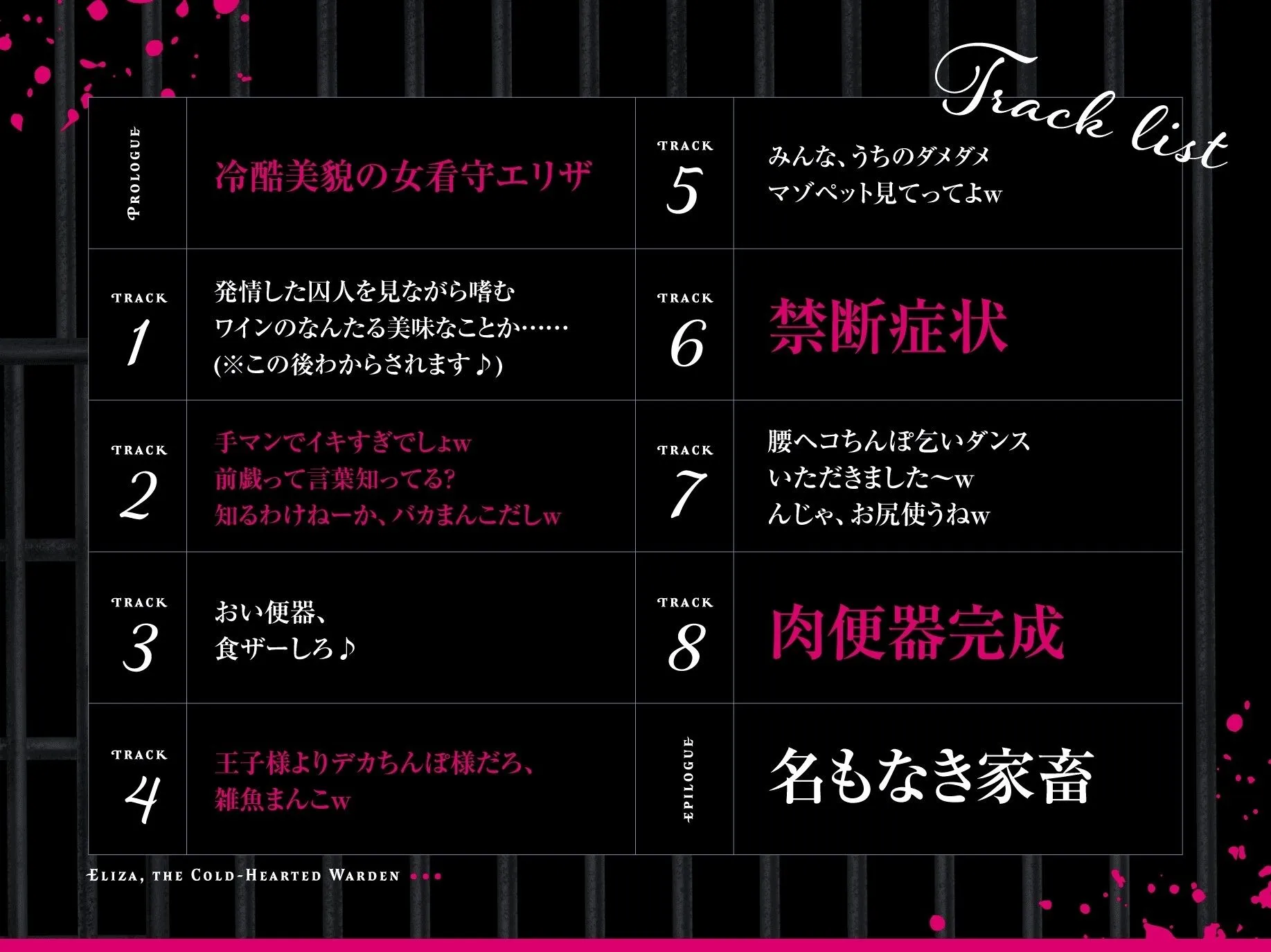 【性格最悪、顔・身体満点→肉便器に躾けなきゃ♪】女看守エリザは、冷酷で加虐趣味を持つ性格破綻者。けどビジュと声、身体は最高♪正直ヤりたくてたまんねぇ……そう舌なめずりをする日々を送っていたあなた(囚人)は、他の囚人や彼女への不満を持つ看守らの助力を経て、エリザに媚薬を盛ることに成功!そしてすぐさま性交♪さあ、容赦は必要ありません。人の皮を被った悪魔を、締まりの悪いガバガバ性処理穴に堕としてしまいましょう(はーと)