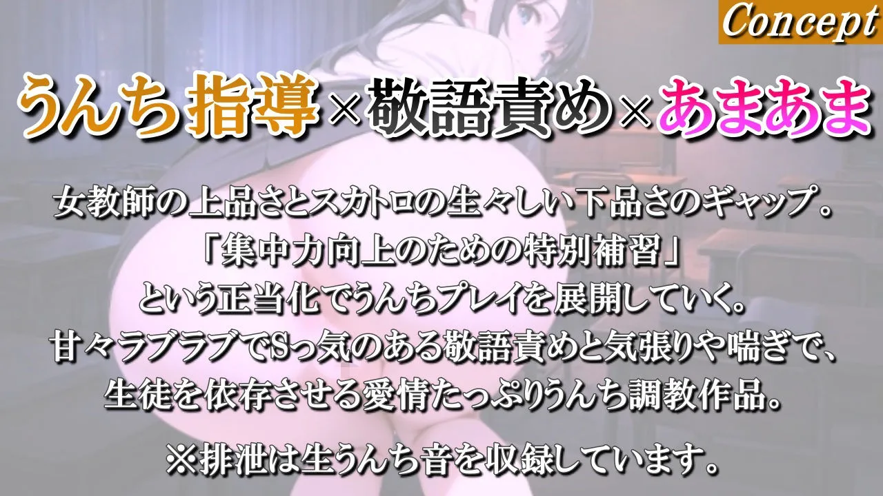 女教師の上品さとスカトロの生々しい下品さのギャップ。 「集中力向上のための特別補習」という正当化でうんちプレイを展開していく。 甘々ラブラブでSっ気のある敬語責めと気張りや喘ぎで、生徒を依存させる愛情たっぷりうんち調教作品。