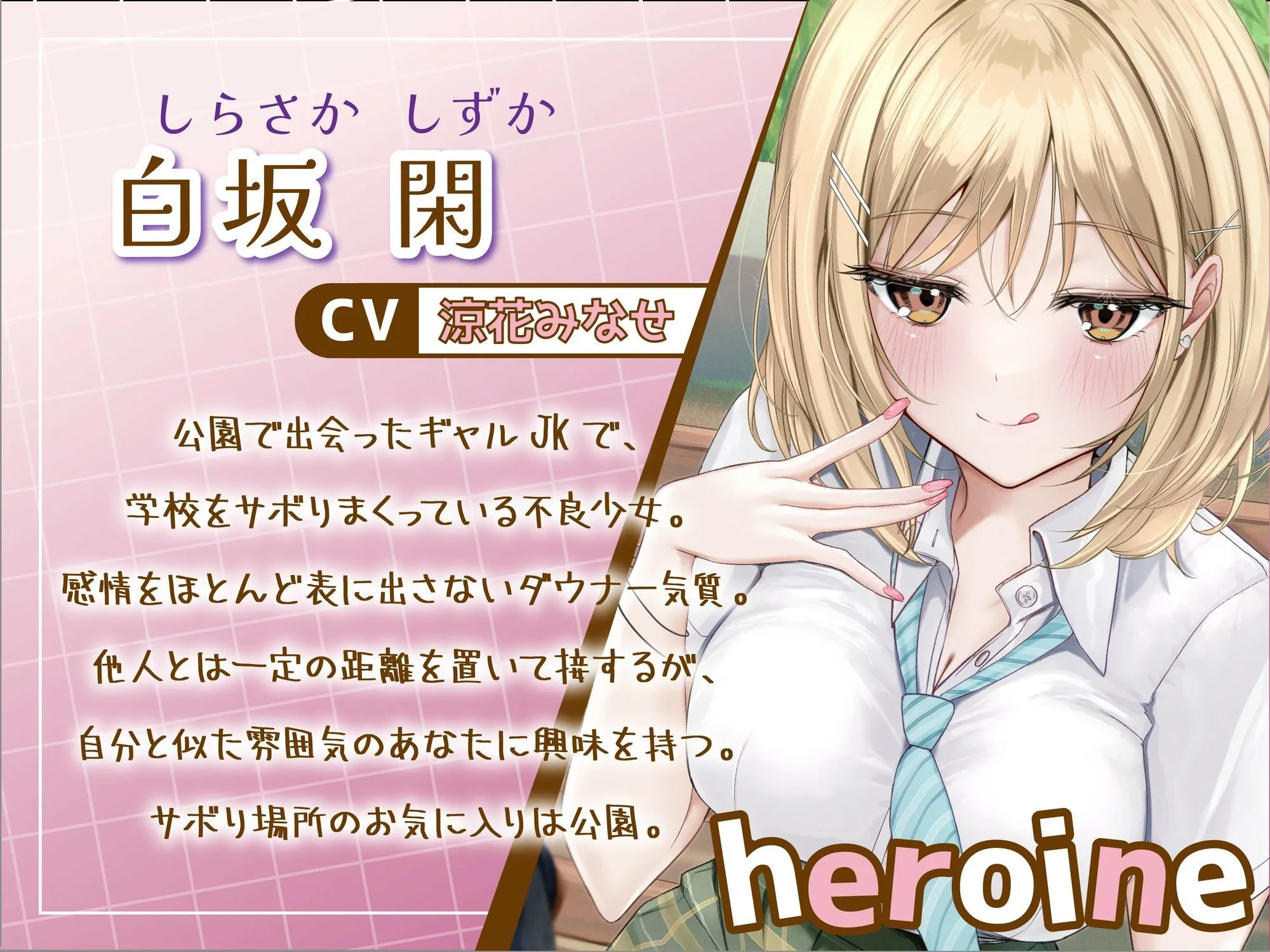 学校サボってるギャルJKとの日常や濃厚エッチを、涼花みなせ様のボイスで楽しむことができます。