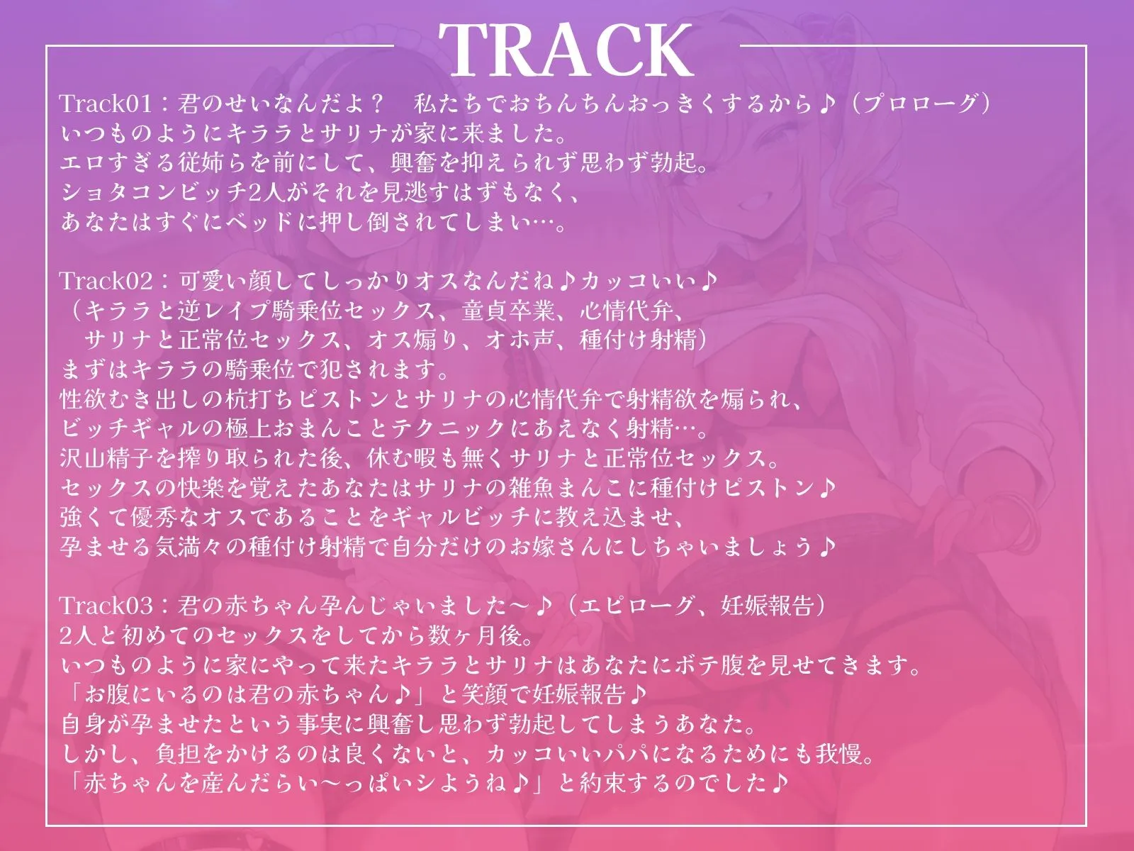 Track02:可愛い顔してしっかりオスなんだね♪カッコいい♪(キララと逆レ●プ騎乗位セックス、童貞卒業、心情代弁、サリナと正常位セックス、オス煽り、オホ声、種付け射精)