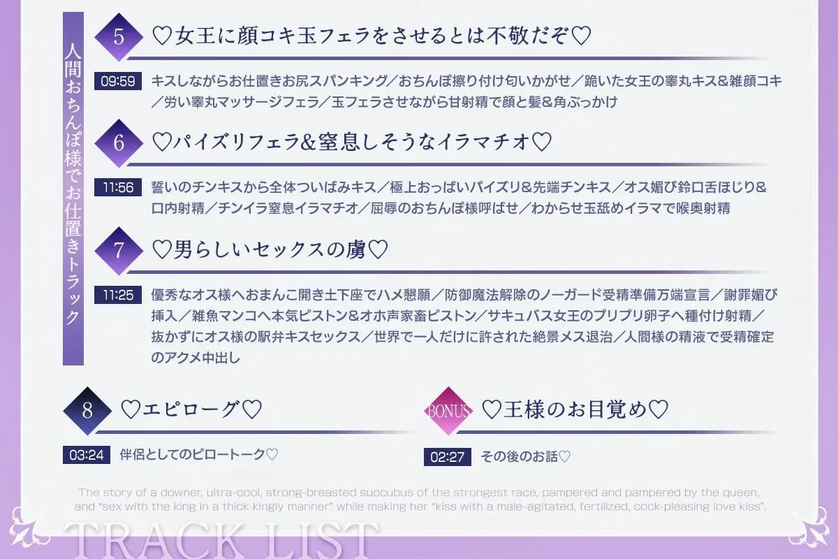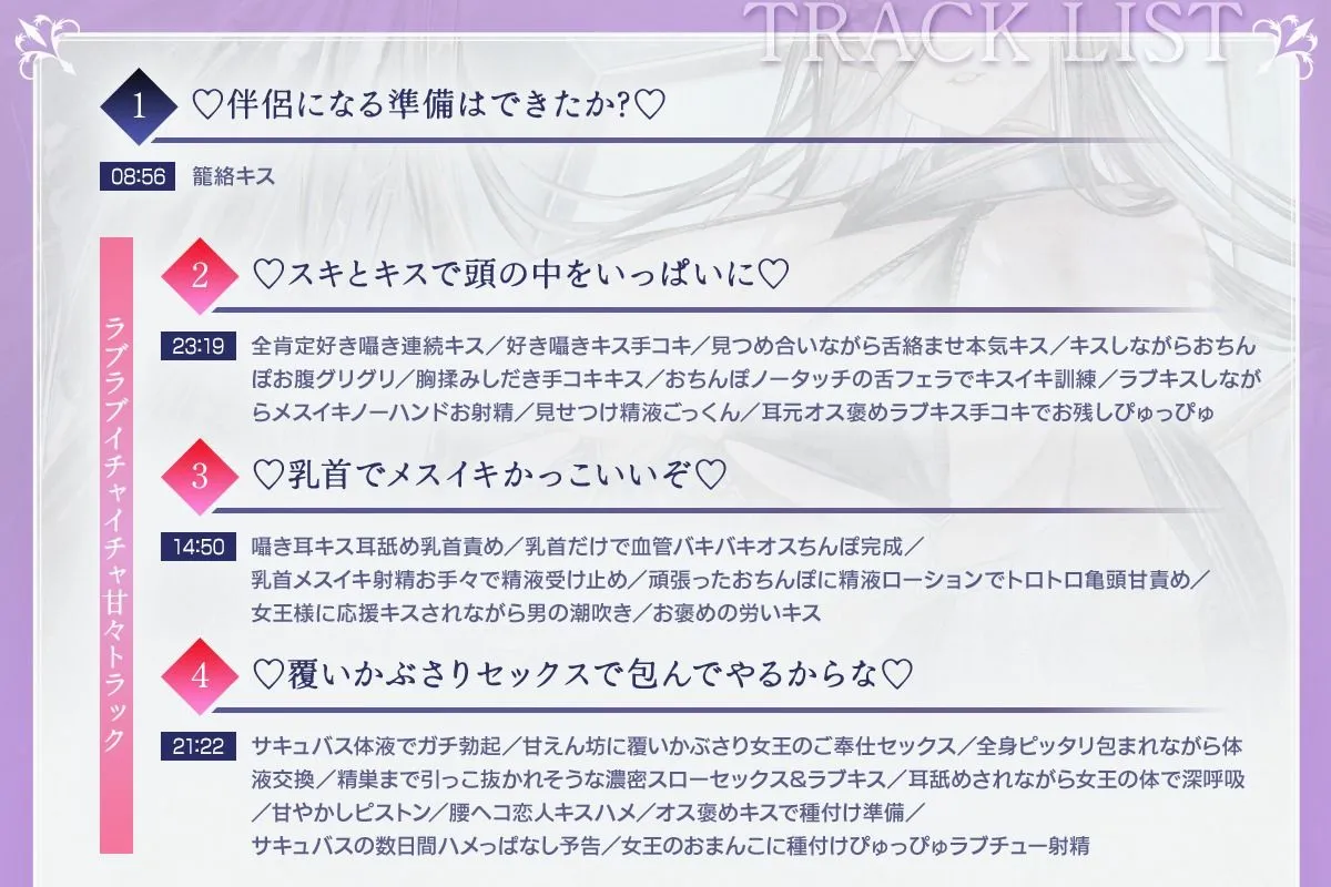 ・サキュバス体液でガチ勃起/甘えん坊に覆いかぶさり女王のご奉仕セックス/全身ピッタリ包まれながら体液交換/精巣まで引っこ抜かれそうな濃密スローセックス&ラブキス/耳舐めされながら女王の体で深呼吸/甘やかしピストン/腰ヘコ恋人キスハメ/オス褒めキスで種付け準備/サキュバスの数日間ハメっぱなし予告/女王のおまんこに種付けぴゅっぴゅラブチュー射精