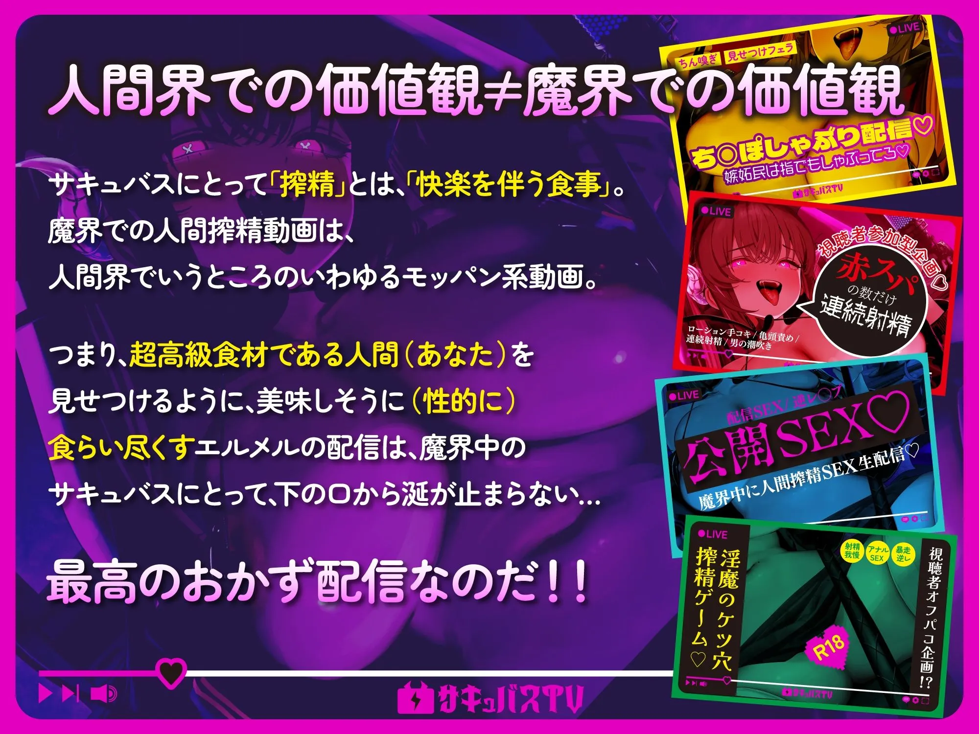 魔界の動画配信サービス『サキュバスTV』そこで配信活動をする淫魔『エルメル』は、人間界から「あなた」を召喚し、配信を始める。魔界で人間は希少な存在で、人間から精液を搾り取る配信は魔界中で大バズり!ゴブリンやオークが主食の淫魔が大半を占める魔界では、貴重な人間を大胆に使った搾精配信が淫魔のオカズ動画として需要があり、エルメルチャンネルは大人気チャンネルに成長する。そして今日も、再生数稼ぎに貴方を使った過激な動画撮影が(はーと)(はーと)