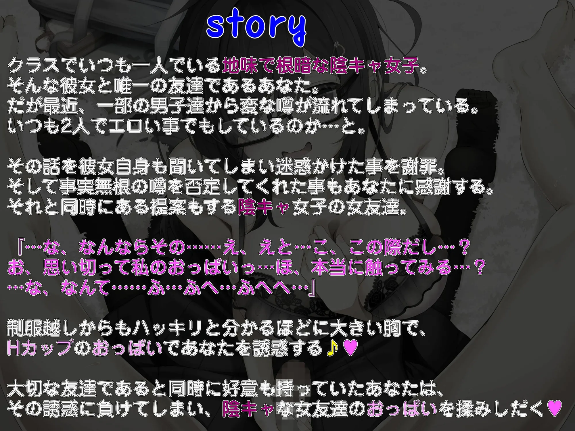 仲のいい根暗で陰キャな女友達のHカップのおっぱいにあなたは誘惑される。密かに好意を抱いてあなたはその誘惑に我慢が出来ず、流されるままにそのおっぱいを揉みしだき(はーと)そのまま最後まで…(はーと)