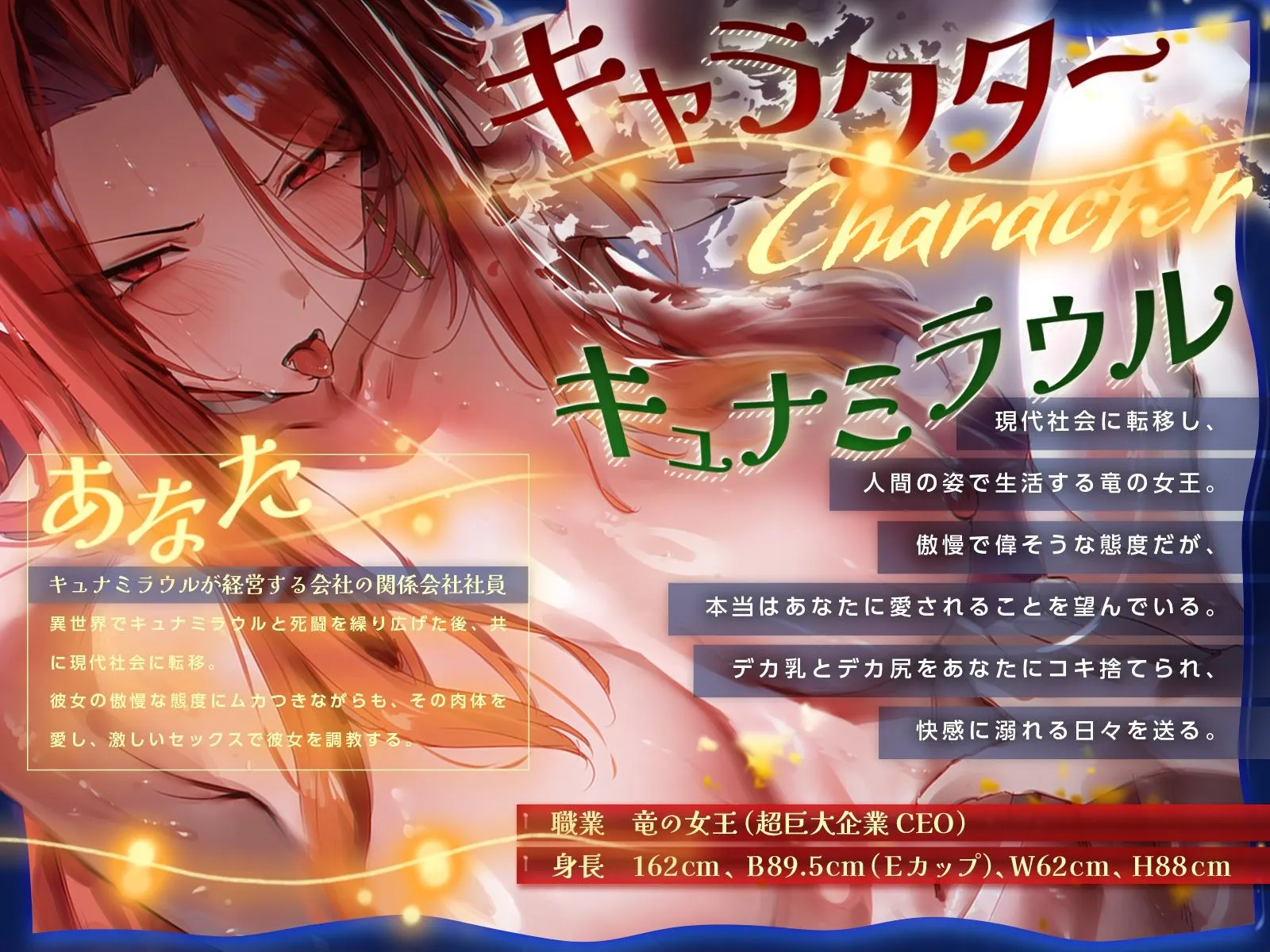 現代社会に転移し、人間の姿で生活する竜の女王。傲慢で偉そうな態度だが、本当はあなたに愛されることを望んでいる。デカ乳とデカ尻をあなたにコキ捨てられ、快感に溺れる日々を送る。