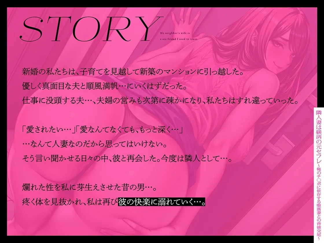 新婚の私たちは、子育てを見越して新築のマンションに引っ越した。優しく真面目な夫と順風満帆…にいくはずだった。仕事に没頭する夫…、夫婦の営みも次第に疎かになり、私たちはすれ違っていった。「愛されたい…」「愛なんてなくても、もっと深く…」…なんて人妻なのだから思ってはいけない、そう言い聞かせる日々の中、彼と再会した。今度は隣人として…。爛れた性を私に芽生えさせた昔の男…。疼く体を見抜かれ、私は再び彼の快楽に溺れていく…。