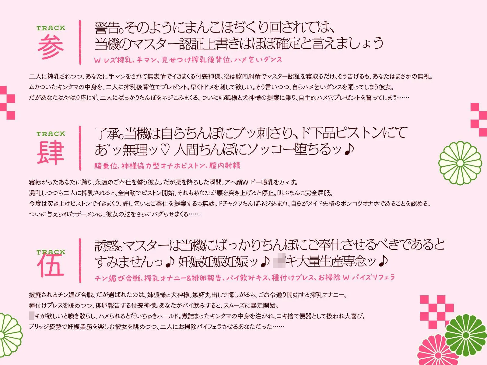 TRACK伍 | 誘惑。マスターは当機にばっかりちんぽにご奉仕させるべきであるとすみませんっ♪ 妊娠妊娠妊娠ッ♪ 〇キ大量生産専念ッ♪(チン媚び合戦、搾乳オナニー&排卵報告、パイ飲みキス、種付けプレス、お掃除Wパイズリフェラ)