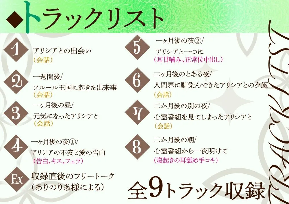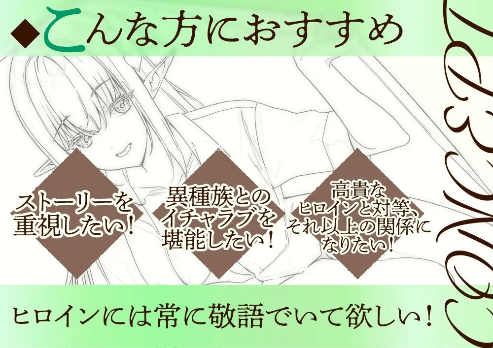 長引く魔王軍との争いのさ中、エルフ界の一国の王女アリシアは人間界へと何とか逃げ延びたが、怪我を負い身動きが取れなくなっていた。そこへ偶然通りかかったあなたに声をかけ何とか救われる。怪我も癒えてくるとアリシアはあなたの事を「旦那様」と呼び慕う様になり...。地位と立場を失ったエルフの姫と、心優しいあなたとの異世界交流ラブストーリー!(CV.ありのりあ様)