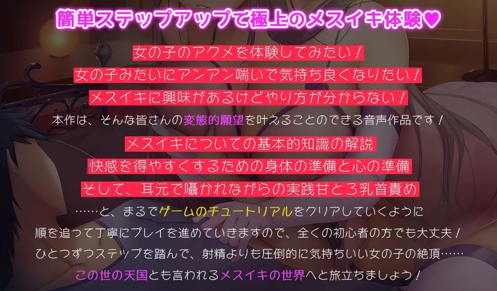 ひとつずつステップを踏んで、射精よりも圧倒的に気持ちいい女の子の絶頂……この世の天国とも言われるメスイキの世界へと旅立ちましょう!