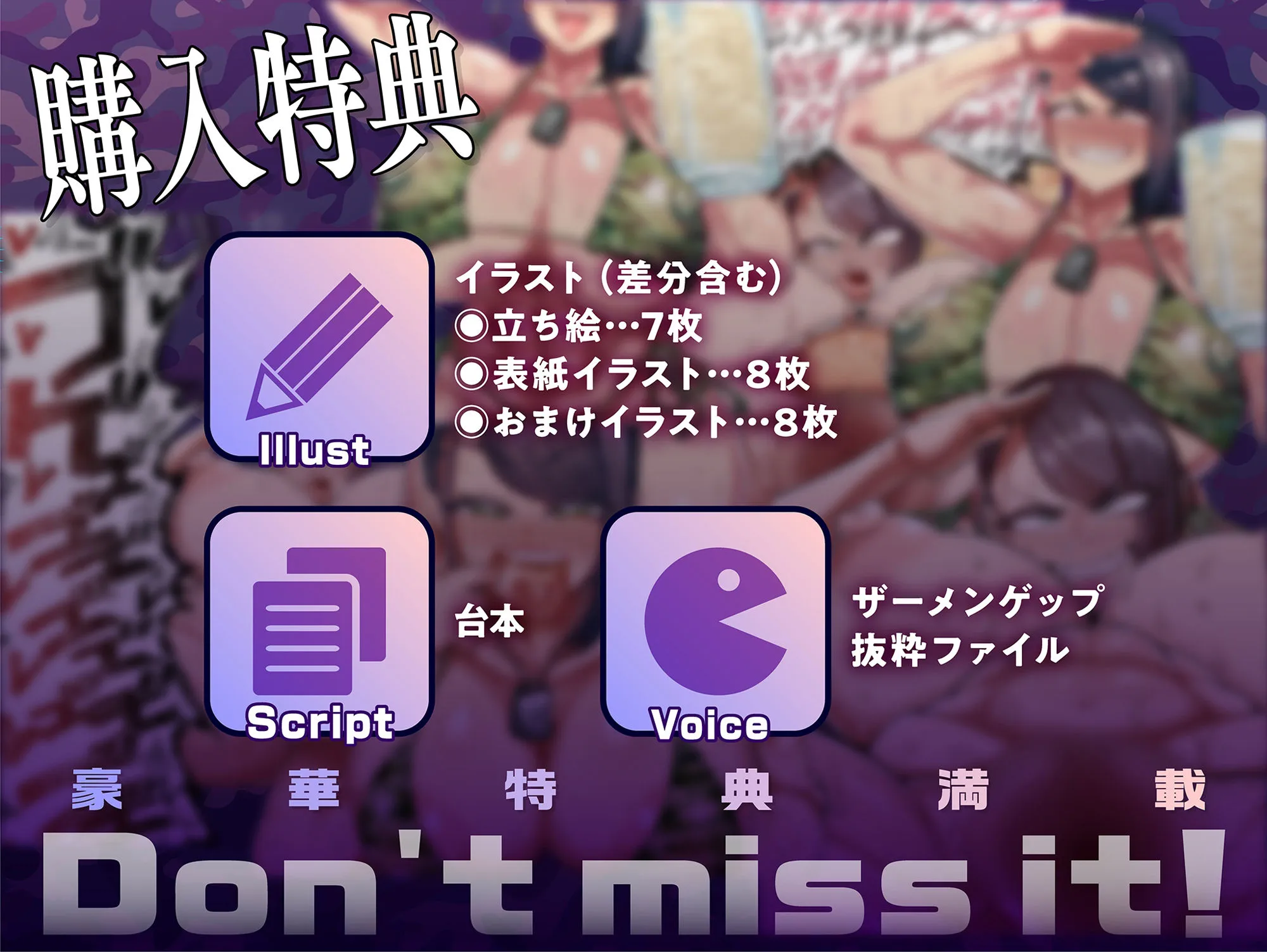 購入者特典として台本の付属と、表紙画像と立ち絵、さらに本編フィナーレを描いたイラストと、差分でザーメンゲップイラストがあります!!
