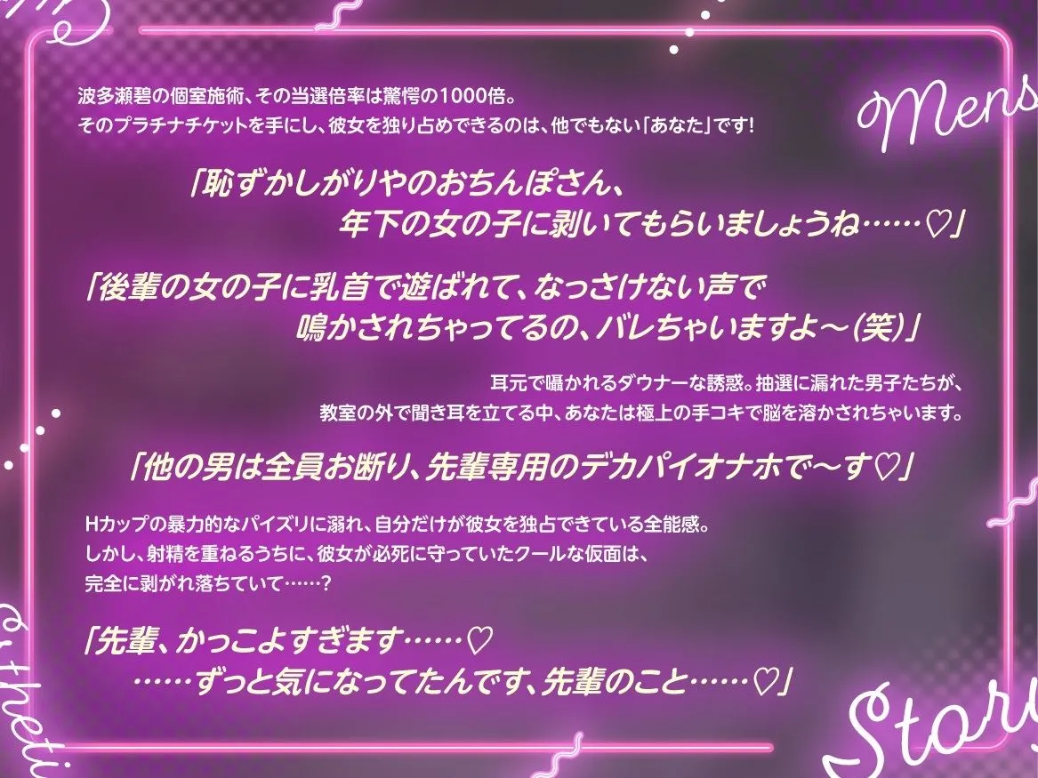 【倍率1000倍の?先輩専用乳マンコ?に中出し(はーと)お願いしま〜す(はーと)】ダウナーJK × 密室メンズエステ × 耳元囁き × 優越感煽り × 甘々ラブラブご奉仕 ……男の性癖全部乗せ!!全男子のオカズを独占して塩対応からガチ恋デレまで味わい尽くす、極上の搾精フルコース!!