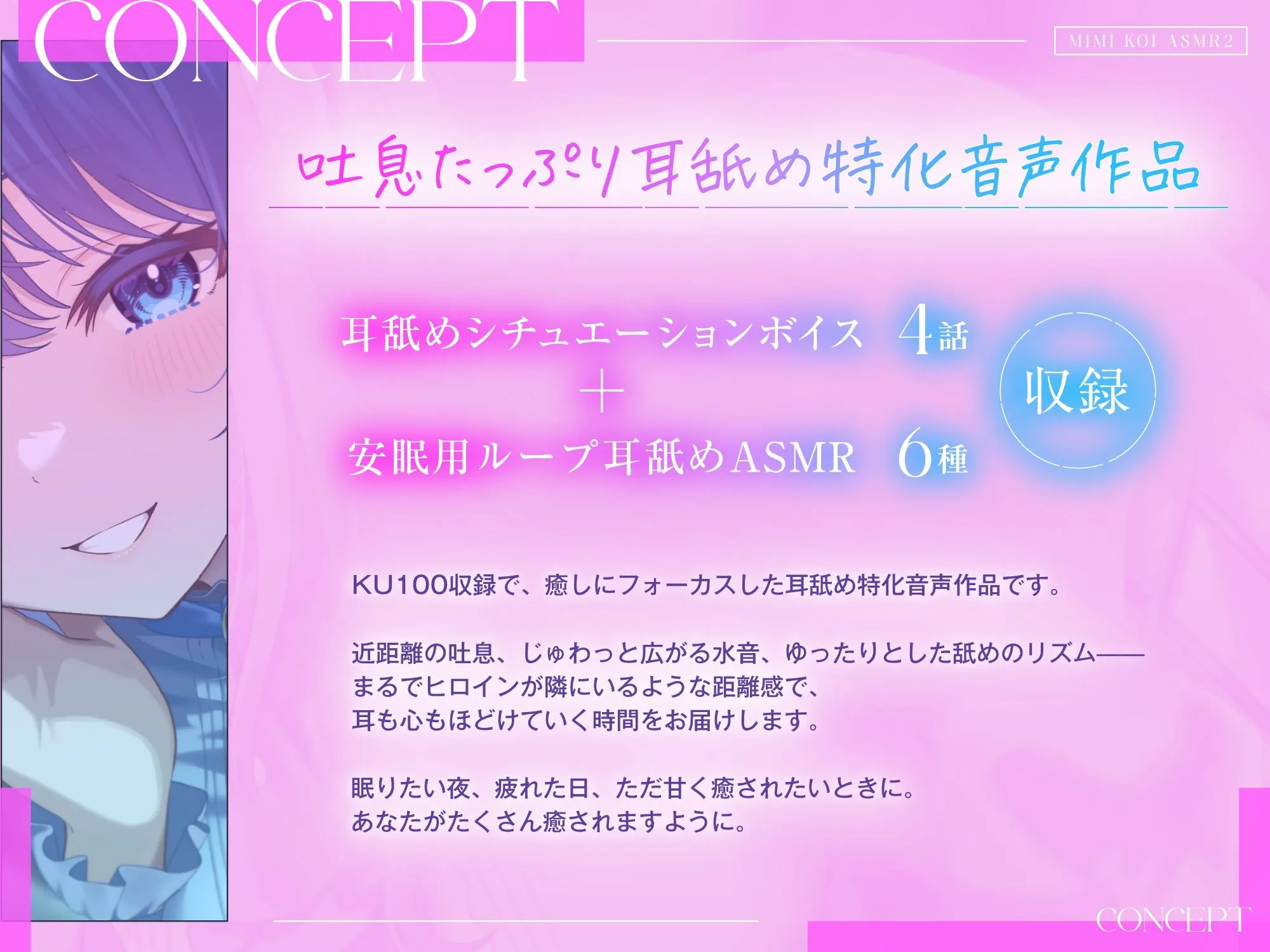 耳舐めシチュエーションボイス4話に加え、安眠用ループ耳舐めASMRを6種類収録。