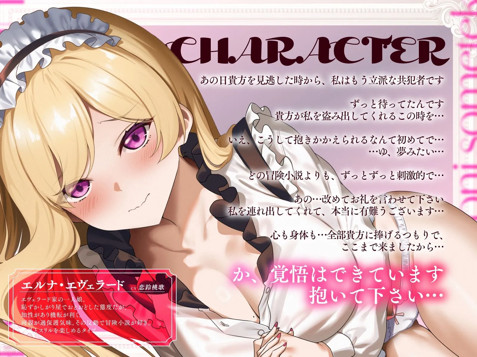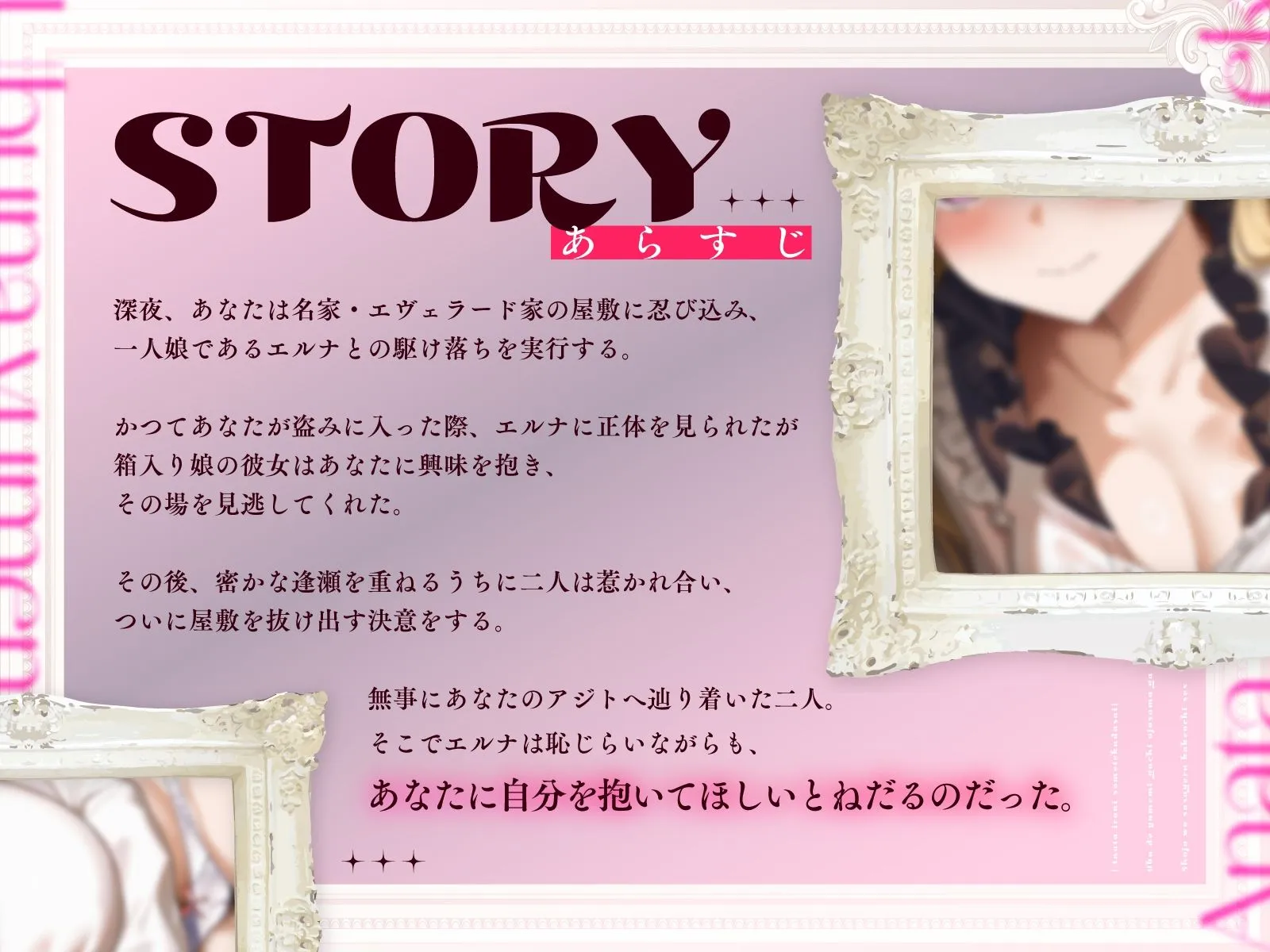 深夜、あなたは名家・エヴェラード家の屋敷に忍び込み、一人娘であるエルナとの駆け落ちを実行する。