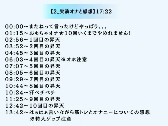実演・オナニー・大量潮吹き・くちゅ音・筋トレ・汗ペチペチ音・ゲップ・妄想・オホ声・吐息・おねだり・指示・おっぱいムギュ・バイノーラル・ノンフィクション・日常