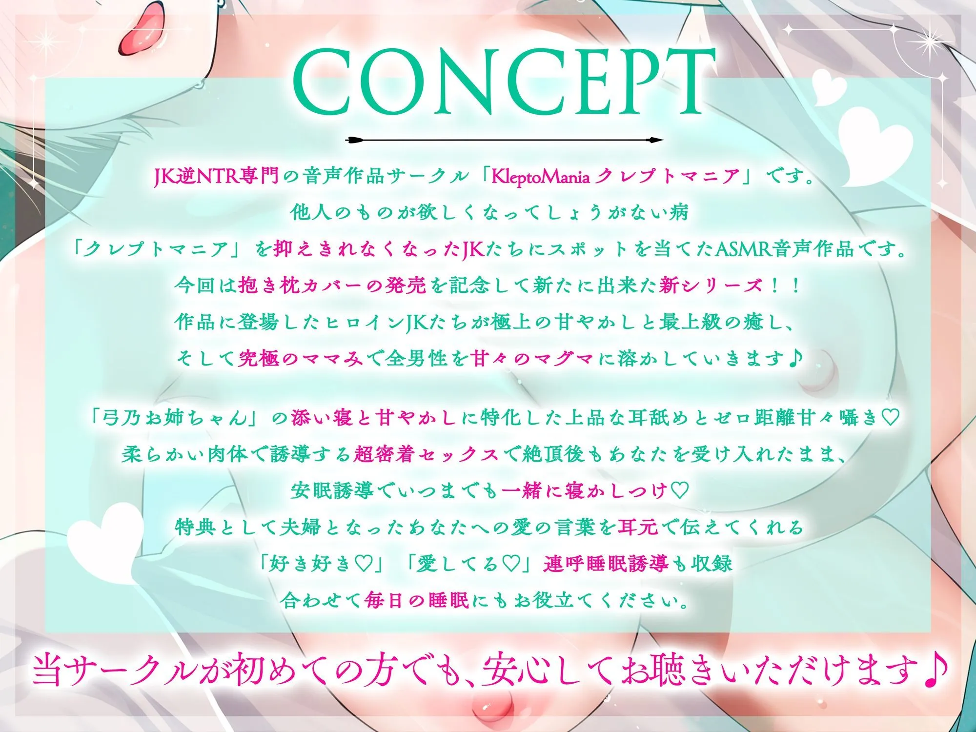 抱き枕カバーとサークル作品を合わせてお聴きいただけることでより楽しめることをそっとお伝えさせていただきます♪