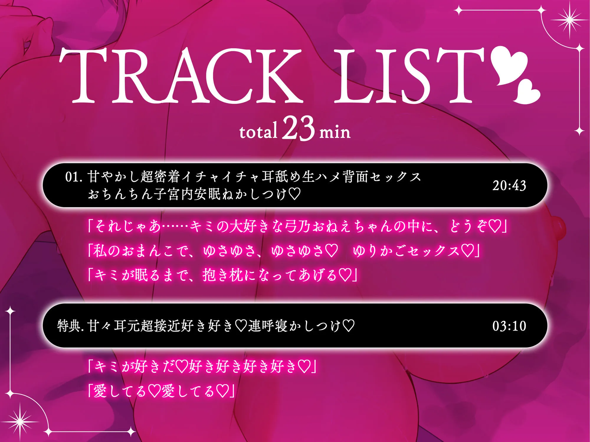 特典として夫婦となったあなたへの愛の言葉を耳元で伝えてくれる「好き好き(ハ〜ト)」「愛してる(ハ〜ト)」連呼睡眠誘導も収録。
